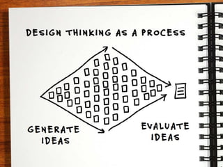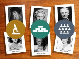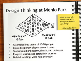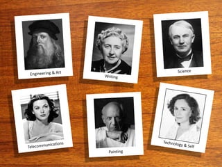 The document discusses the concept of deliberate design thinking, showcasing insights from renowned designers and inventors such as Thomas Edison, Agatha Christie, Leonardo da Vinci, Hedy Lamarr, and Pablo Picasso. It emphasizes the importance of deliberate research, practice, and networking within the context of design thinking. The overall message highlights how studying the history and methodologies of these masters can inform and inspire current design practices.
