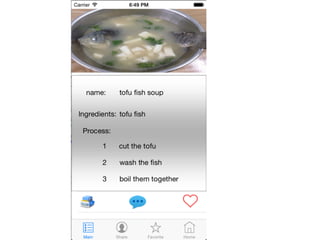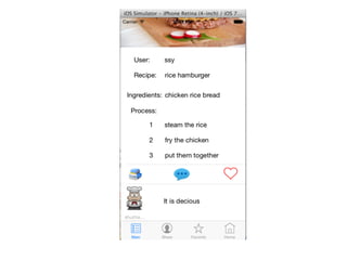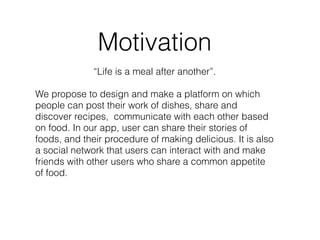 The document proposes a social media platform called Delicious for sharing recipes and discovering new recipes. The platform would allow users to post pictures and step-by-step instructions of dishes they created, share the ingredients needed, and interact with other users by friending them, liking recipes, commenting on recipes, and finding nearby users to cook with. The goals are to create a place for recipe sharing, recipe discovering through search features, and social interaction between users with similar food interests.