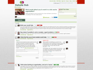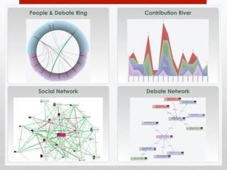 The document presents research on the effectiveness of network versus threaded interfaces for online deliberation, emphasizing issues with traditional chronological formats that hinder idea evaluation and participation. The exploratory study finds that network visualizations improve users' understanding of complex arguments, enhance task performance, and evoke positive emotional responses compared to linear interfaces. Ultimately, it suggests that dynamic network visualizations could enrich online discourse by providing better structural insights into argumentation.