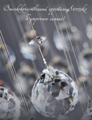 Документ содержит обширный перечень хрустальных светильников, включая детали по стилю, цвету, типу крепления и характеристикам ламп. В списке представлены различные модели с параметрами мощности, совместимой лампой и коммерческими номерами. В основном акцент сделан на адаптацию светильников для интерьеров в классическом и элегантном стилях.