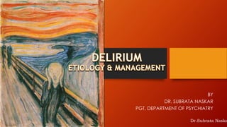 This document provides an overview of delirium, including its definition, history, epidemiology, predisposing factors, etiology, pathophysiology, and management. Delirium is characterized by an acute decline in consciousness and cognition, particularly impaired attention. It has been described since Hippocrates' time. It commonly occurs in elderly hospitalized patients, with prevalence rates as high as 80% in intensive care units. Predisposing factors include older age, dementia, sensory impairment, and medical comorbidities. Delirium has many potential causes including infections, medications, metabolic disturbances, and neurological disorders. The pathophysiology is complex and likely involves imbalances in several neurotransmitter systems such as acetylcholine, dopamine