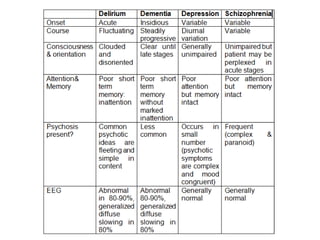 This document provides an overview of delirium, including its introduction, history, epidemiology, etiology, neuropathology, diagnosis, differential diagnosis, course, prevention and management. Delirium is characterized by an acute change in mental status and cognition that fluctuates over the course of a day. It has a prevalence of 5-55% among elderly hospitalized patients and is associated with increased mortality, longer hospital stays and higher healthcare costs. The pathophysiology involves multiple neurotransmitter systems and risk factors include predisposing patient factors and precipitating insults like infection, medication side effects or metabolic disturbances. Prevention focuses on reducing risk factors and early diagnosis and treatment can improve outcomes.