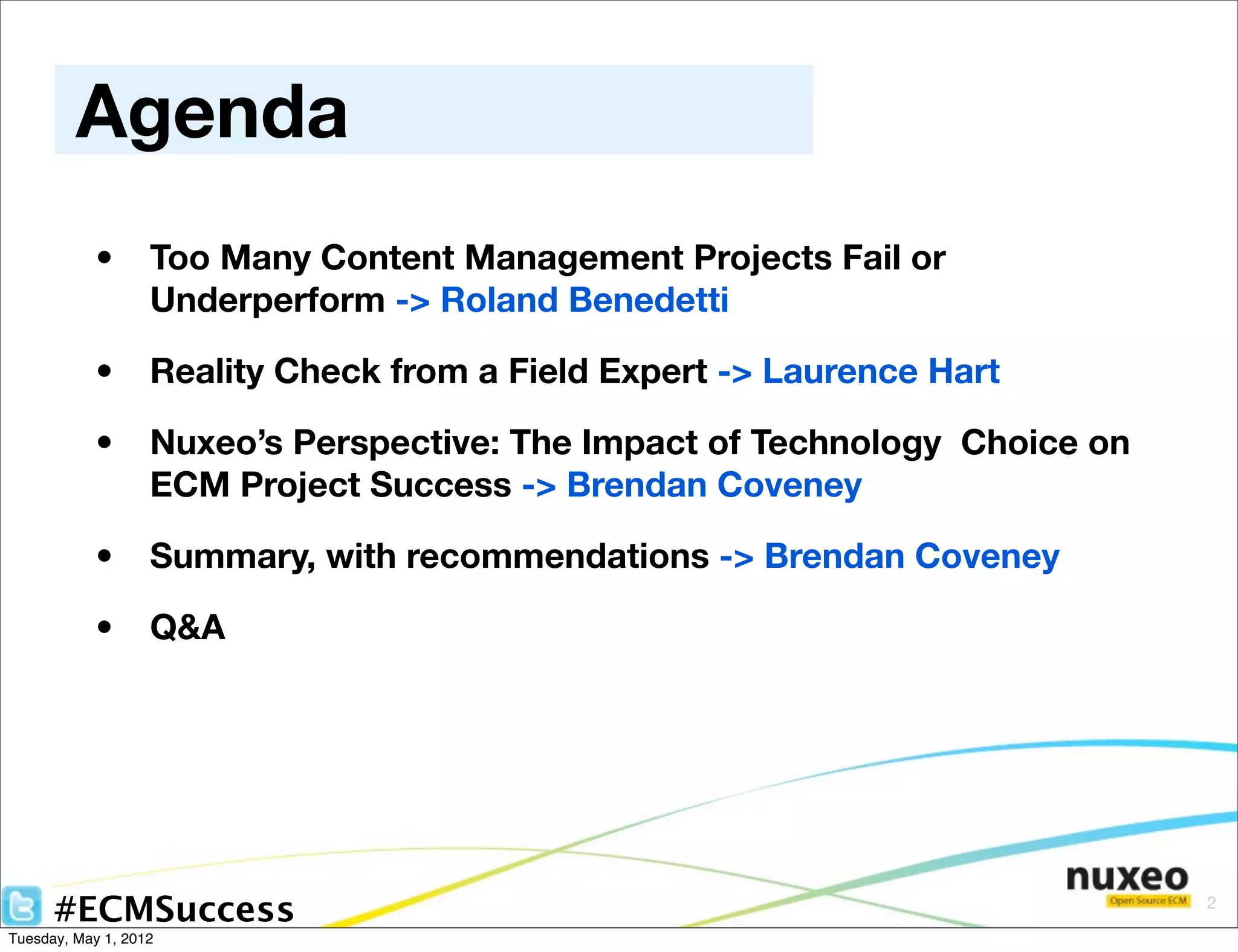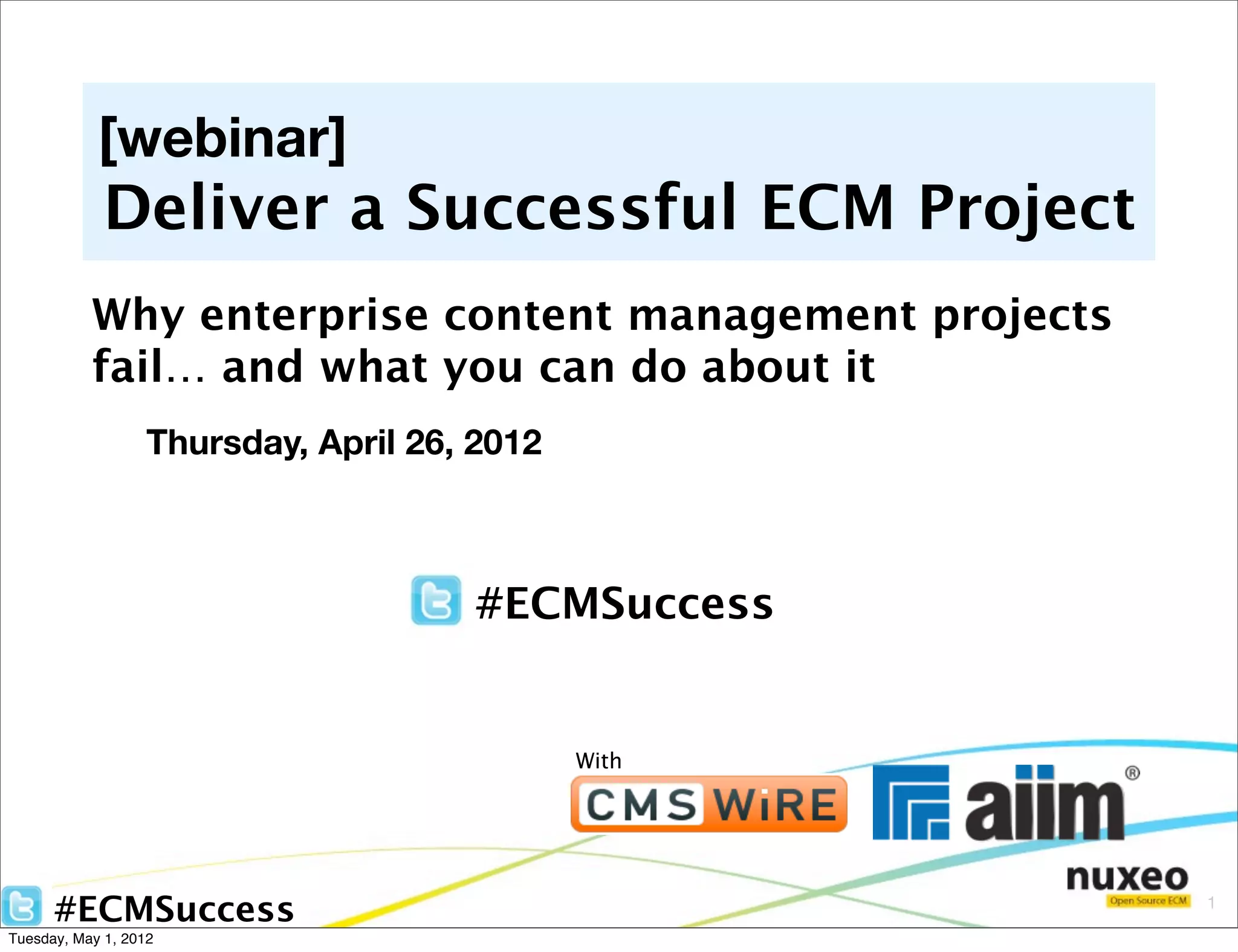 The webinar discussed reasons why enterprise content management (ECM) projects often fail and provided recommendations for success. It covered topics such as how lack of planning, communication, innovation and experience can lead to failure; the importance of properly aligning technology to requirements; and tips for a successful project like being agile, iterative, flexible, empowering developers, maintaining control, and asking for expert guidance. The webinar emphasized that both technology and process are important for ECM project success.
