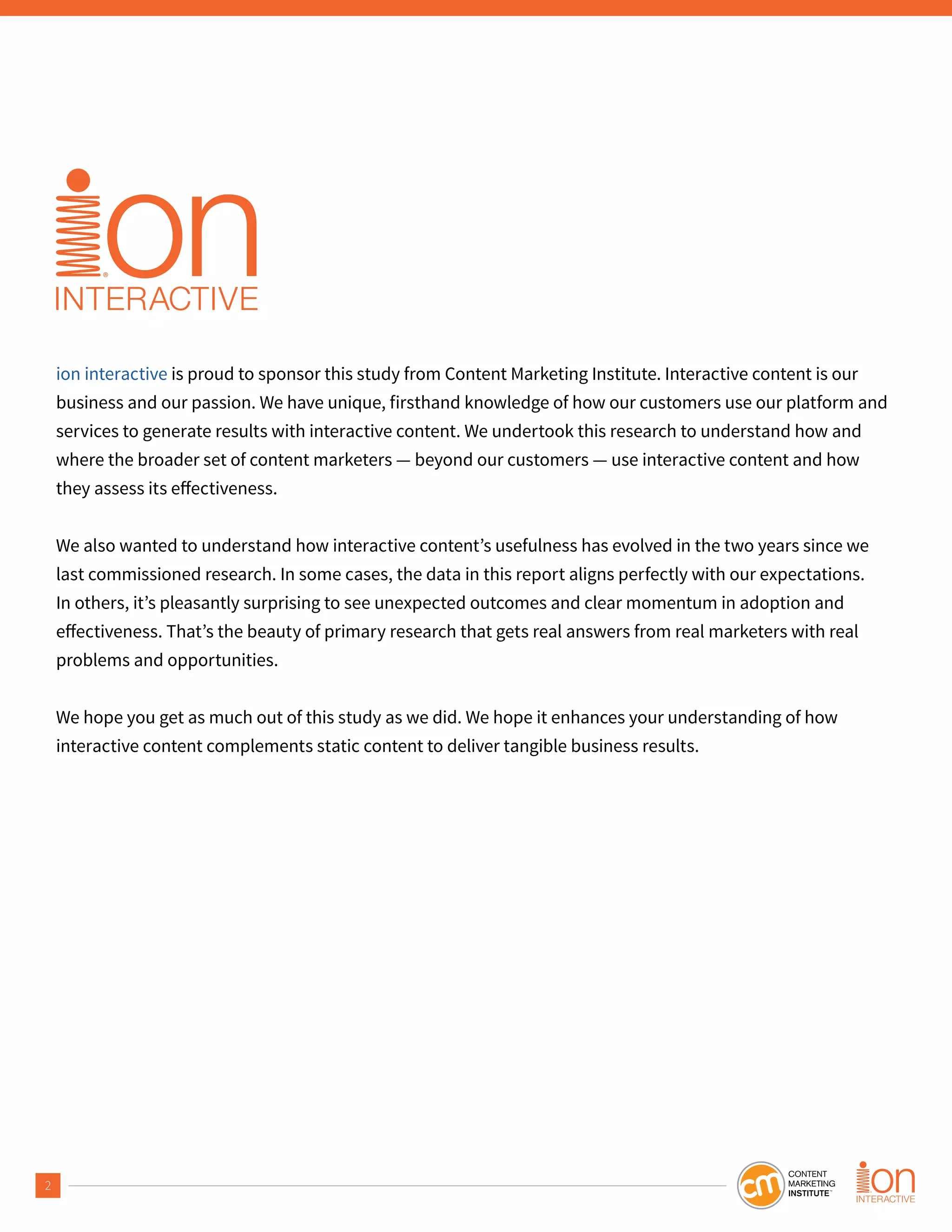 The majority of content marketers surveyed (53%) currently use interactive content as part of their content marketing strategies. Usage is higher among large enterprises. Most users find interactive content effective at grabbing attention, enhancing message retention, generating repeat visits, and increasing engagement. Common interactive content types used include assessments, calculators, contests and quizzes. Marketers see educating audiences as the primary purpose of interactive content over engagement or lead generation. Measurement of interactive content's effectiveness remains immature, though marketers with more experience report higher effectiveness.