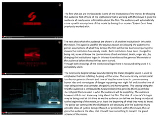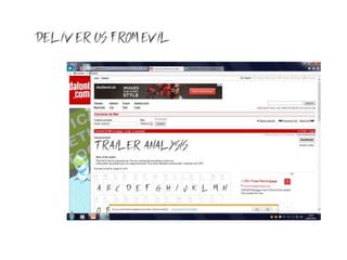 The document provides a detailed analysis and summary of a movie trailer. It examines how the trailer uses various techniques to immerse the audience and build suspense, while also providing context about the plot and genre. This includes the use of logos, settings, characters, music, anticipation/climax building scenes, references to other similar films, and more. The overall goal of the trailer analysis is to understand how it engages audiences and leaves them wanting to learn more about the film.