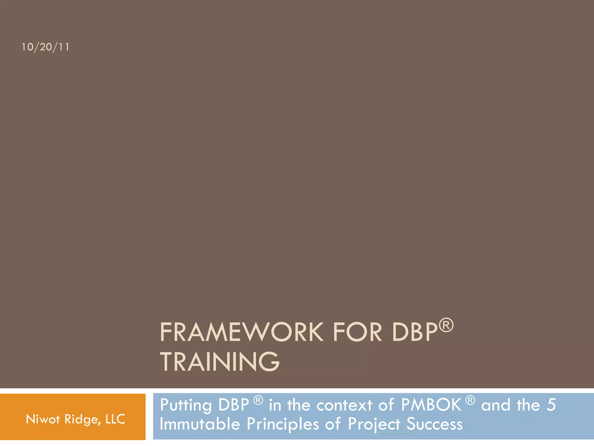 The document outlines a framework for Deliverables Based Planning® (DBP) aligned with PMBOK® principles, emphasizing the importance of answering five key questions for project success. It details program management processes, critical practices for execution, and the need for credible data to enhance the probability of program success. Additionally, it connects various project management knowledge areas and process groups to ensure effective planning, execution, and performance monitoring.