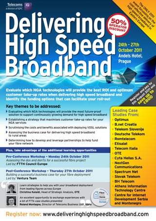 The document outlines a conference focused on delivering high-speed broadband, scheduled from October 24th to 27th, 2011, in Prague. Key themes include evaluating various broadband technologies, assessing funding options, maximizing customer take-up rates, and sharing lessons from successful deployments across Europe. Featuring expert panels and workshops, the event aims to address challenges in broadband rollout and explore future strategies for operators.