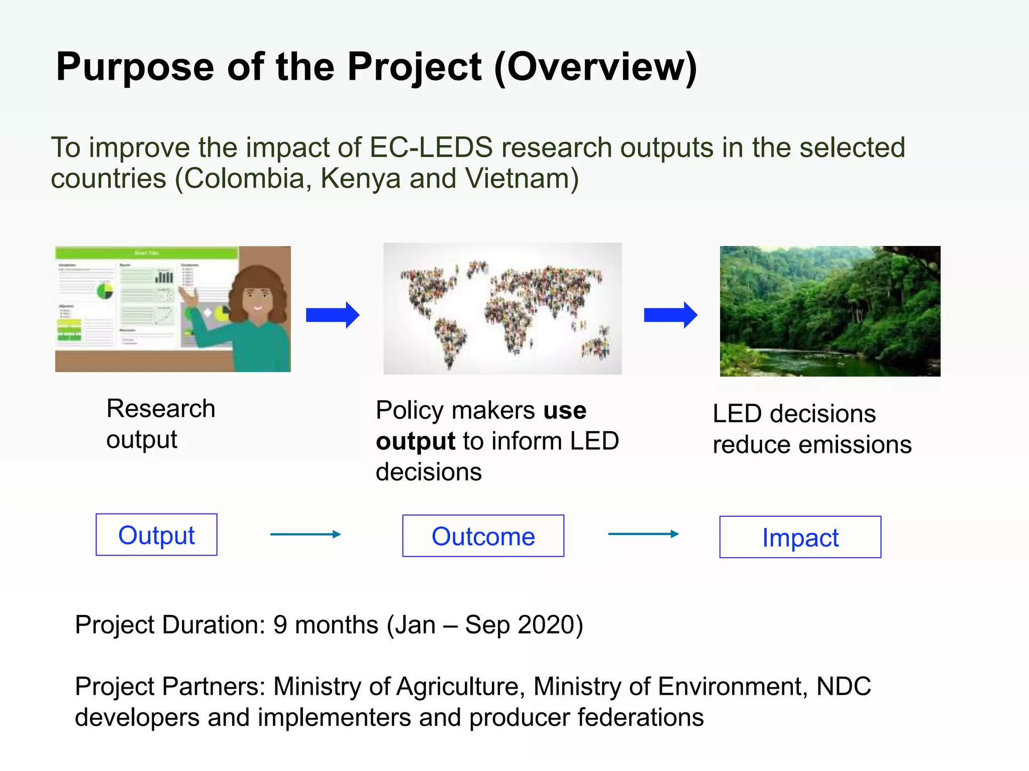 The USDA EC LEDS Project aimed to improve the impact of research on low-emission development strategies in Colombia, Kenya, and Vietnam over 9 months. The project objectives were to 1) increase policymakers' use of research outputs to inform decisions, 2) improve policymakers' access to knowledge on low-emission development, and 3) synthesize lessons on best linking research to policymakers. The implementation process included evaluating impact pathways, co-designing action plans, implementing actions, and conducting a synthesis. Key lessons focused on co-developing outputs and outcomes tailored to policy needs and strategies. Potential future areas of work included mobilizing finance for climate strategies and bundling research with mitigation options to engage more actors.