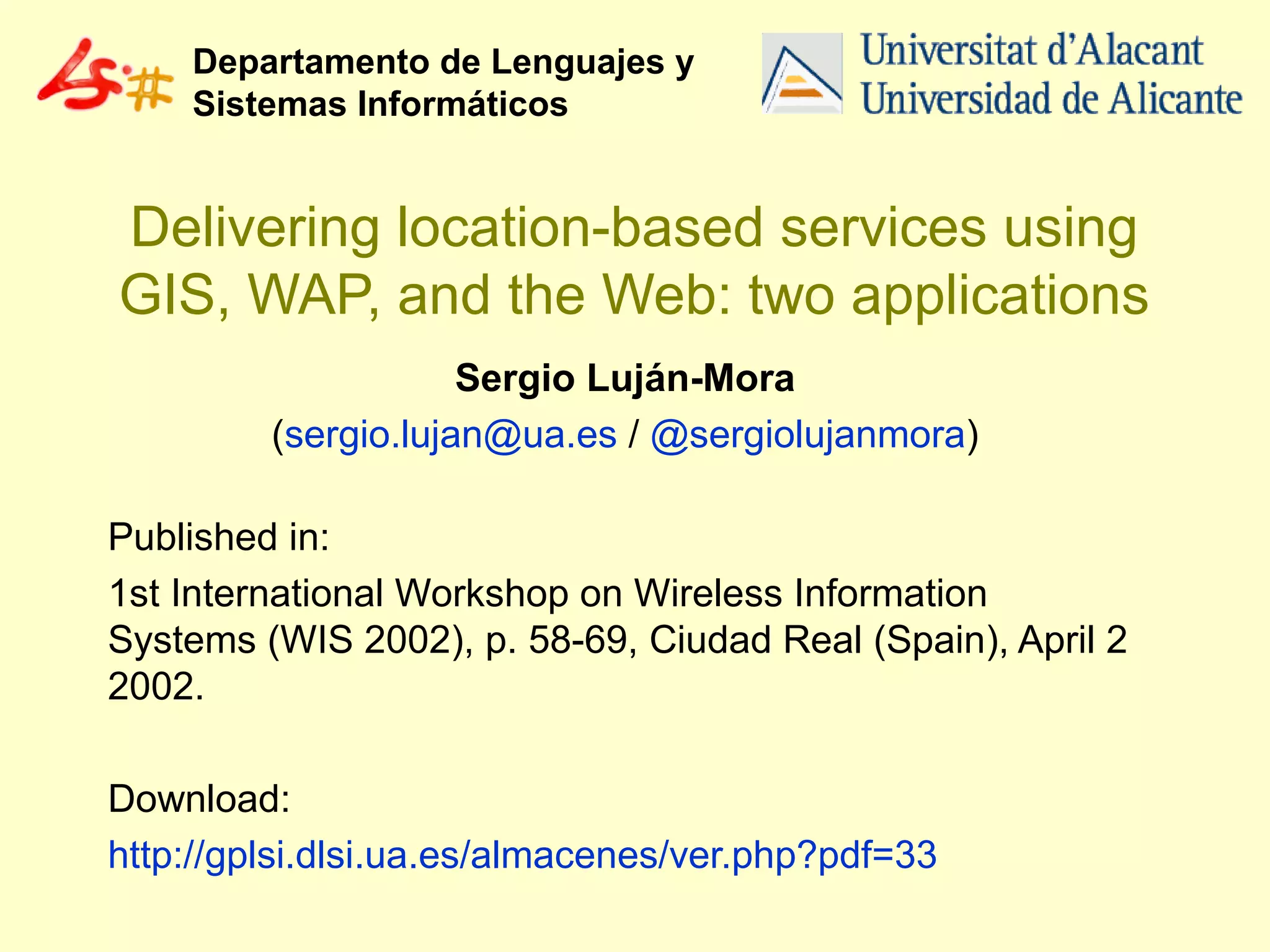 The document discusses delivering location-based services through two applications utilizing GIS, WAP, and the web, highlighting the advantages of mobile positioning using GSM networks. It describes the architecture of the system, applications for resource searching and data acquisition, and the technology enabling these services. Future work includes developing new applications and enhancing dynamic mapping capabilities.