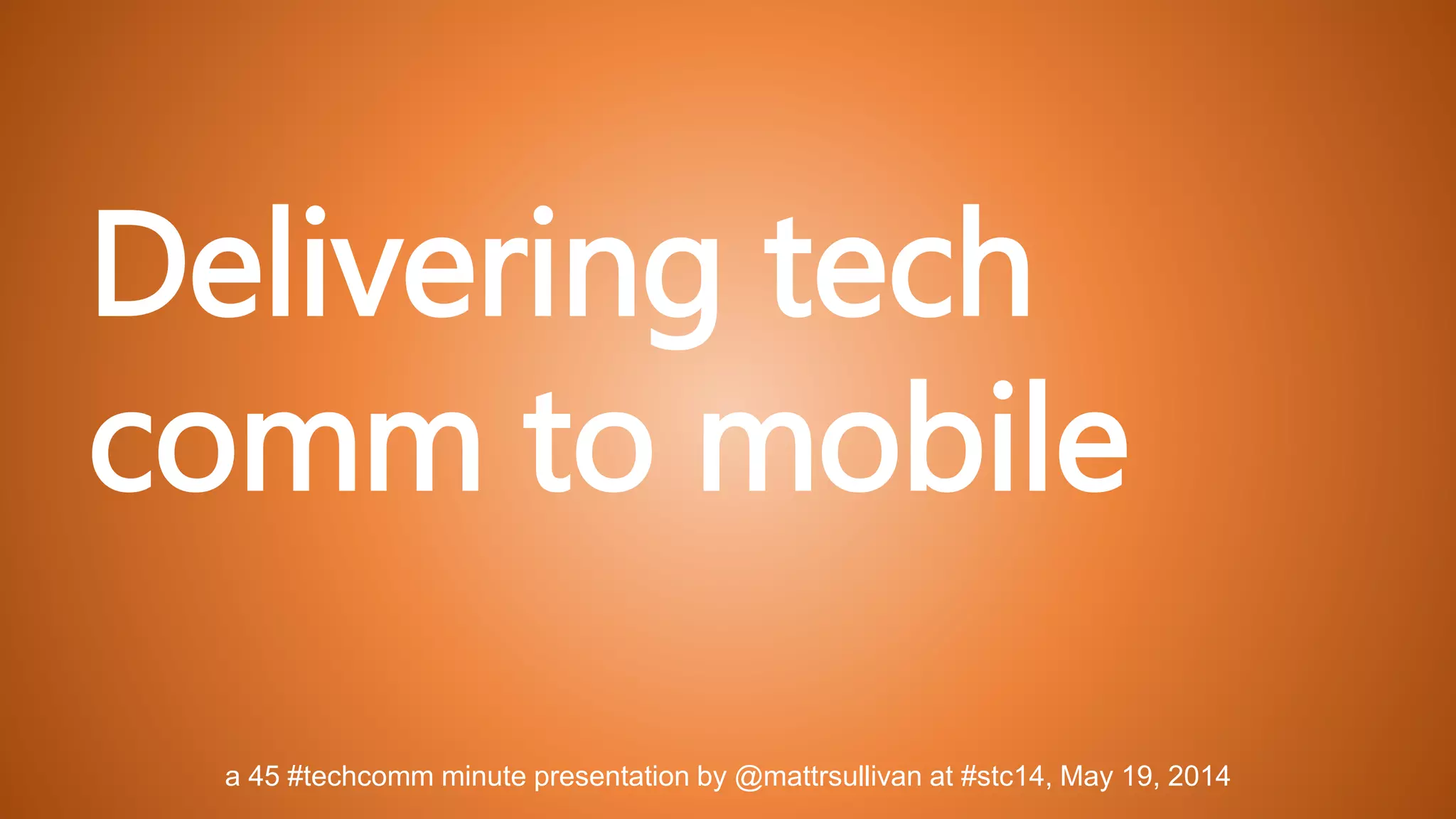 Matt Sullivan gave a 45 minute presentation at STC14 on delivering technical communication to mobile. He discussed using structured formats like XML, DITA and DocBook to enable content reuse, localization, and mobile accessibility. FrameMaker and RoboHelp were presented as tools that can be used together based on project needs - FrameMaker for medical devices needing rich media and reuse, and RoboHelp for online help and multi-channel delivery. The presentation emphasized starting with user needs and choosing tools to meet responsive output, rich media handling, intuitive authoring and the ability to brand outputs for mobile.