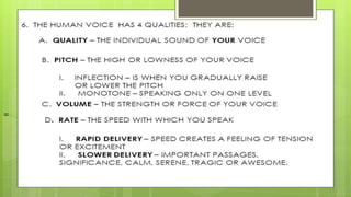 The document provides tips for delivering an effective presentation. It discusses keeping the presentation simple, short, and leaving time for audience questions. A good presenter is judged by how they respond to audience questions. Additional tips include knowing the audience and their level of knowledge, understanding the purpose of the presentation, doing research, rehearsing with a listener for feedback, pacing the presentation with about one minute per slide, being familiar with the room and equipment, having backup plans if technology fails, and interacting with the audience through questions, eye contact and avoiding reading slides.