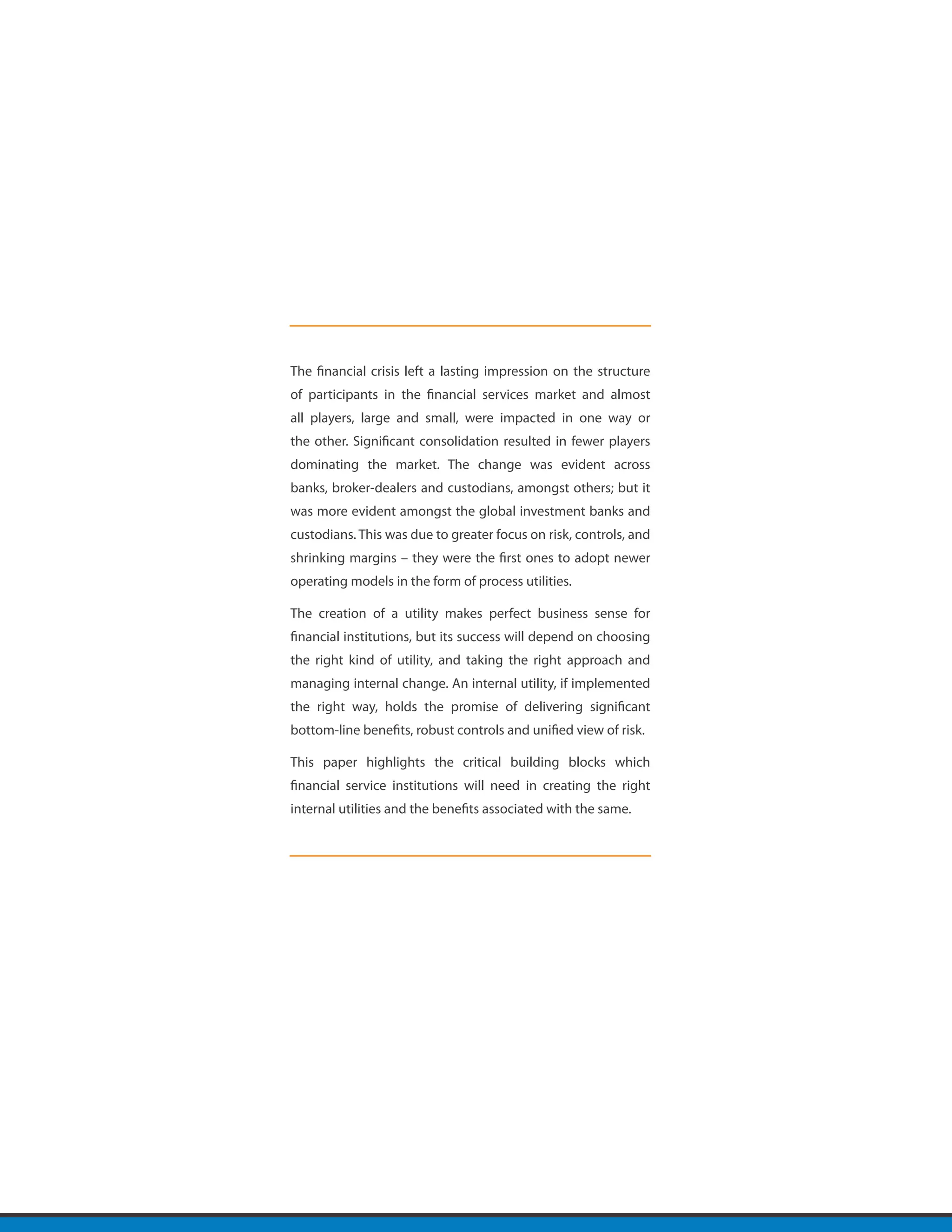The document discusses the creation of internal utilities by financial institutions to improve efficiency. It explains that internal utilities centralize functions across business lines to reduce costs through standardization and scale. Key benefits include lower operational risk, improved regulatory compliance, and allowing staff to focus on core activities versus utility functions. Challenges in setting up utilities include complex existing systems, lack of automation, inability to scale capacity, and pressure to reduce costs. Internal utilities are becoming more common as financial institutions seek process efficiencies.