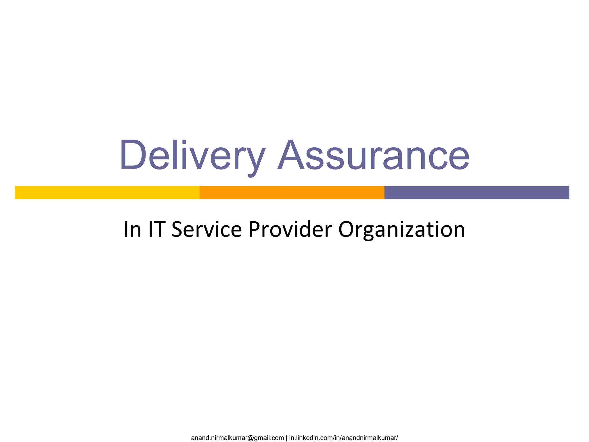 The document discusses the significance of delivery assurance in IT service provider organizations, emphasizing the need for proactive management to address delivery issues that often arise during program initiation. It outlines a framework for implementing a delivery assurance function, including components such as continuous auditing, risk assessment, and governance, to enhance service quality and mitigate risks. Key factors for successful delivery assurance include senior management commitment and effective collaboration between the delivery and assurance teams.