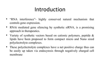 1. Delivery systems of siRNA include synthetic vectors based on cationic polymers, peptides, and lipids that form polyelectrolyte complexes with siRNA for cellular uptake.