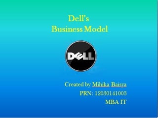 Dell's business model involves selling computers directly to customers by building computers based on customer orders rather than maintaining large inventories. This allows Dell to minimize costs and bring new products to market quickly. Dell's direct sales and build-to-order model has proven more successful than traditional manufacturers' strategies and enabled Dell to increase its market share and profitability. The document outlines Dell's business model and compares it to traditional manufacturers, and notes how Dell's customer-focused model gave it an advantage in the PC industry.