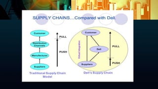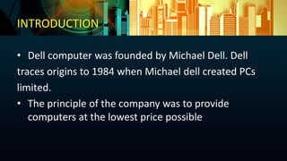 Dell was founded by Michael Dell in 1984 to provide computers directly to customers at low prices. Dell pioneered the direct sales model, removing retailers and assembling computers based on customer orders. Key products include desktops, servers, notebooks. Dell has global operations and major manufacturing centers in China. It has grown through acquisitions like Alienware and EMC. Strengths include direct sales, customization and reliability. Weaknesses include slow market share growth and supplier dependence. Opportunities lie in online retail and new markets. Threats include outdated products and competitive pricing. Major competitors include HP, Lenovo, Apple.