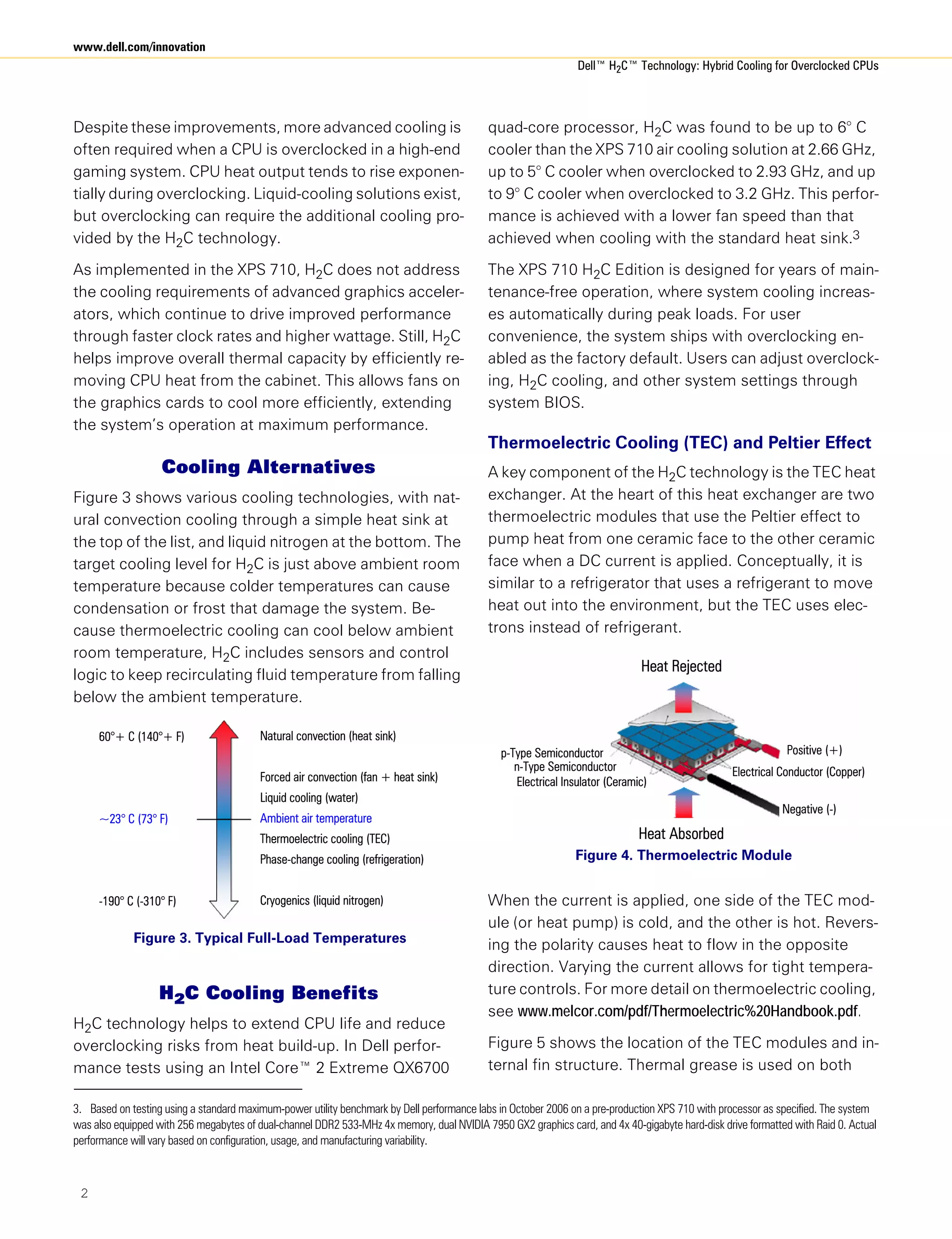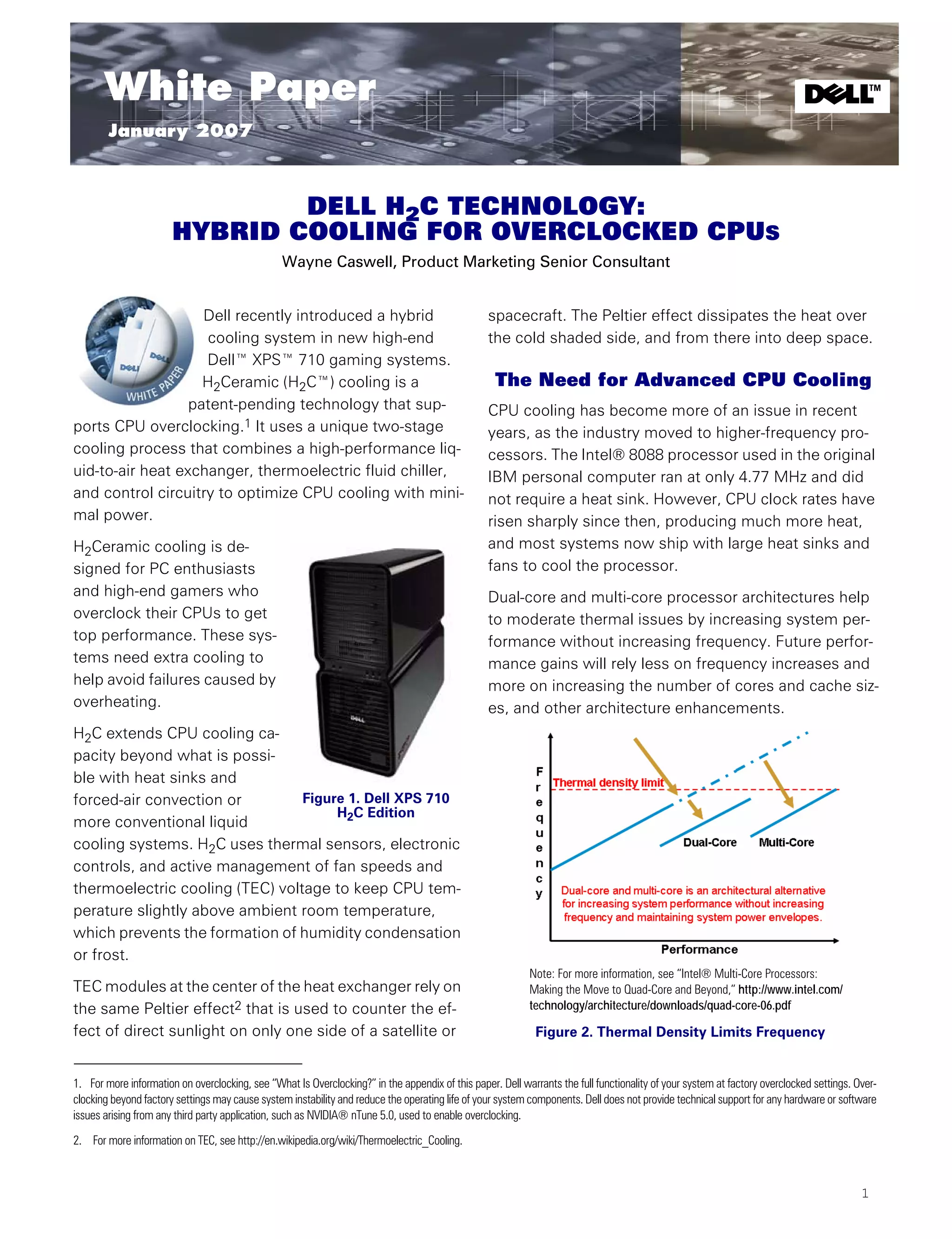 The document discusses Dell's H2C (hybrid cooling) technology developed for overclocked CPUs in high-performance gaming systems, emphasizing its advanced cooling capabilities compared to traditional methods. H2C technology utilizes a unique two-stage cooling system incorporating thermoelectric cooling (TEC) to manage CPU heat efficiently and prevent overheating during overclocking. This innovation addresses the increased thermal output from modern multi-core processors and aims to enhance performance while ensuring system stability.