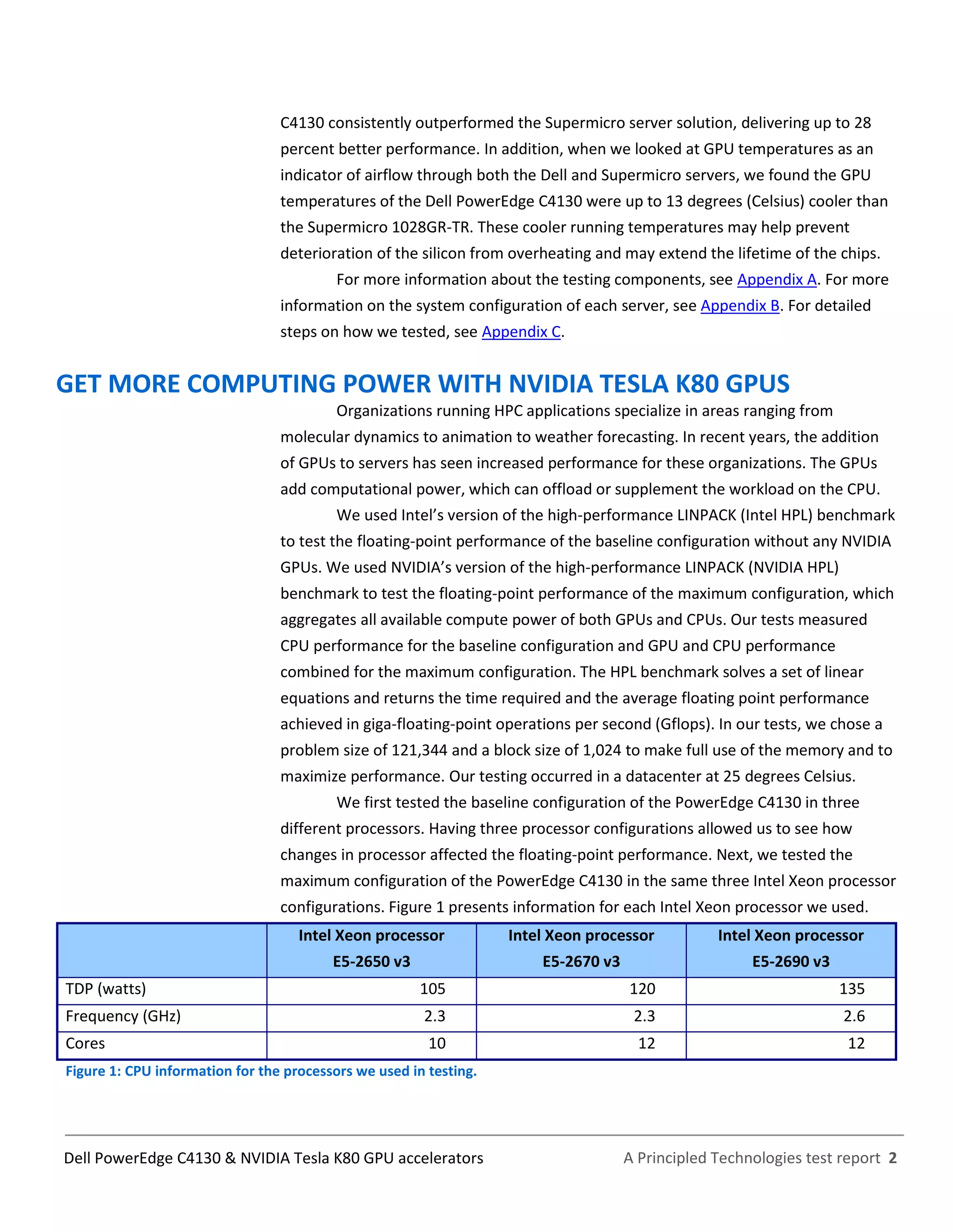 The Principled Technologies test report evaluates the Dell PowerEdge C4130 server equipped with NVIDIA Tesla K80 GPUs against a Supermicro 1028GR-TR server. Results indicate that the C4130 provides up to 9.37 times greater floating-point performance compared to its baseline configuration and outperforms the Supermicro model by up to 28% across various processor configurations, while maintaining cooler GPU temperatures. The C4130's design facilitates better airflow, potentially extending hardware life, making it a strong option for high-performance computing needs.