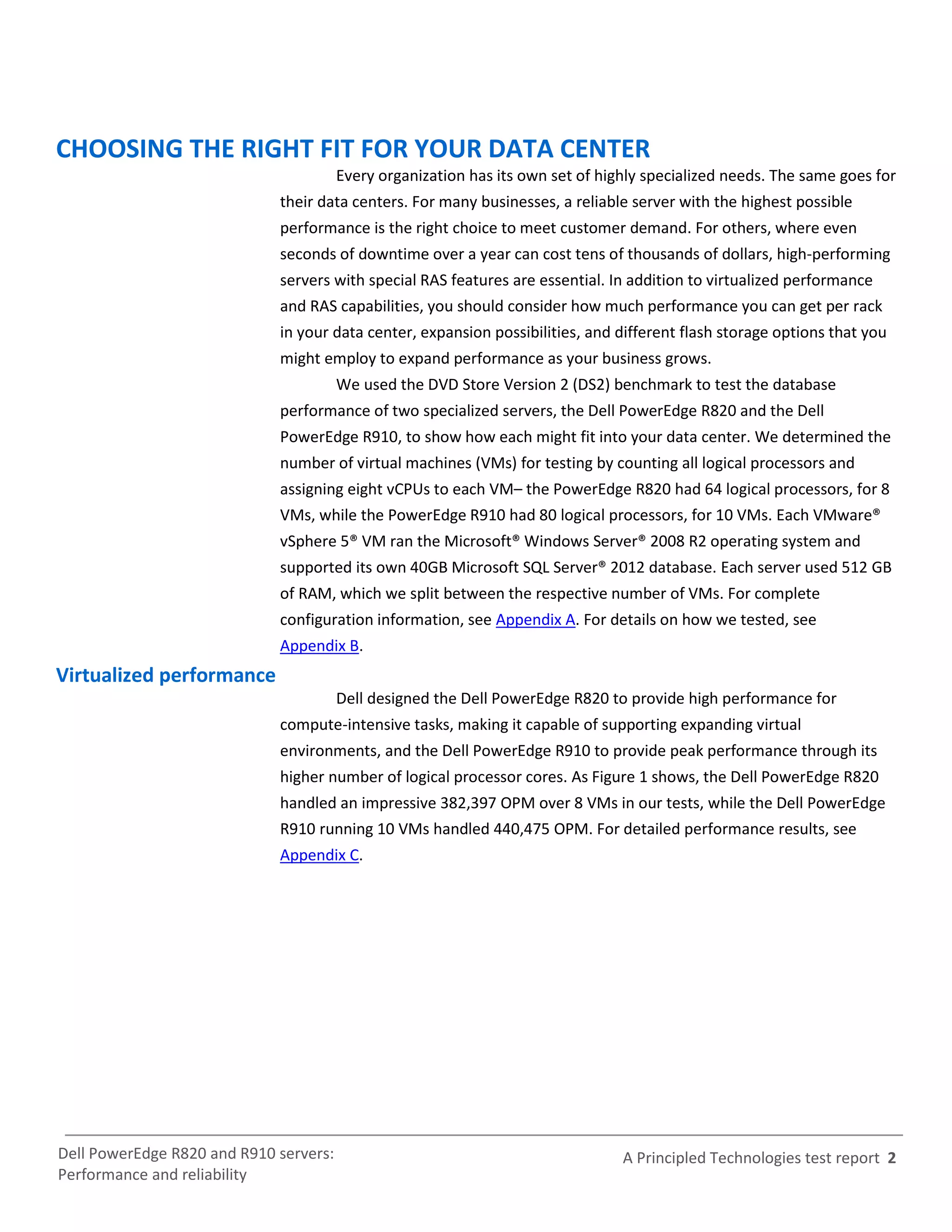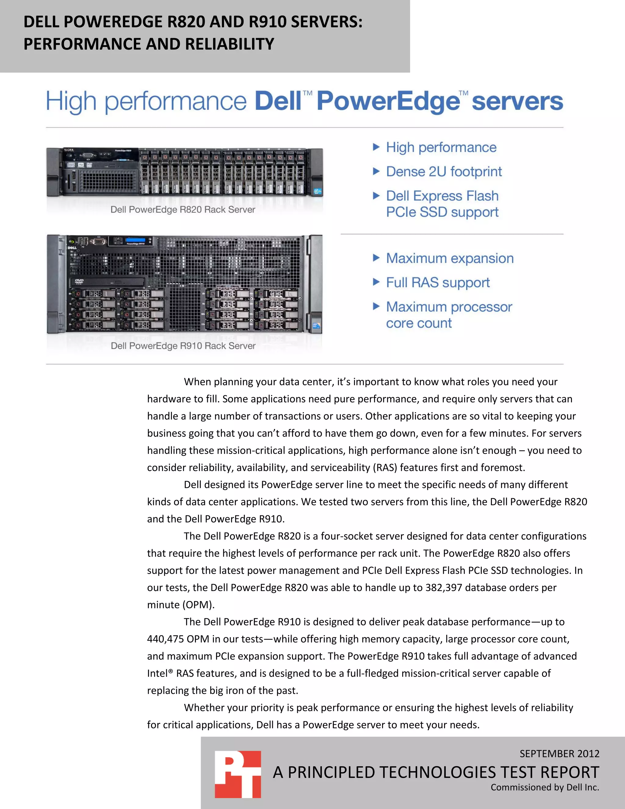 The document provides an evaluation of Dell's PowerEdge R820 and R910 servers, focusing on their performance and reliability characteristics essential for data center applications. The R820 excels in high performance per rack unit, achieving 382,397 orders per minute (opm), while the R910 offers superior memory capacity and peak performance with 440,475 opm, making it ideal for mission-critical applications. Key considerations for choosing between them include performance requirements, redundancy needs, and expansion capabilities.