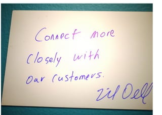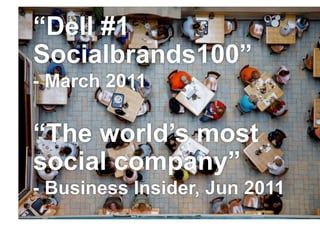 The document outlines Dell's strategic use of social media to enhance business operations and customer engagement, highlighting milestones from 2005 to 2011. It emphasizes the importance of listening, engaging, and acting on customer feedback through various platforms and internal collaborations. Key lessons include the integration of social media across business functions, empowering employees, and understanding the ROI of social media initiatives.