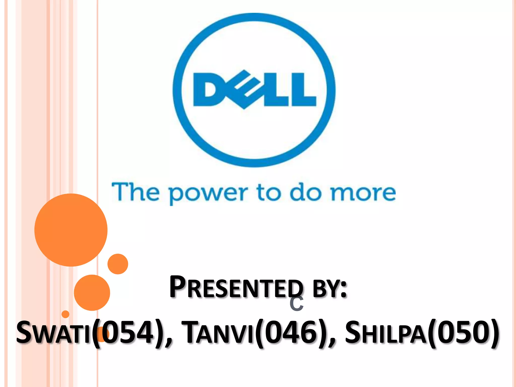 This document provides an overview of Dell's corporate social responsibility efforts. It discusses Dell's history and founding by Michael Dell. It outlines Dell's mission statement focusing on customer, team, and community satisfaction. It also describes Dell's contributions through supporting customers with disabilities, partnering with organizations, promoting environmental sustainability, supporting youth learning and disaster relief initiatives, maintaining responsible supplier standards, and employee programs. The document highlights Dell's social innovation challenge and fundraisers like a university dance marathon that support its children's medical center. It concludes with future projects around empowering women and innovating education.