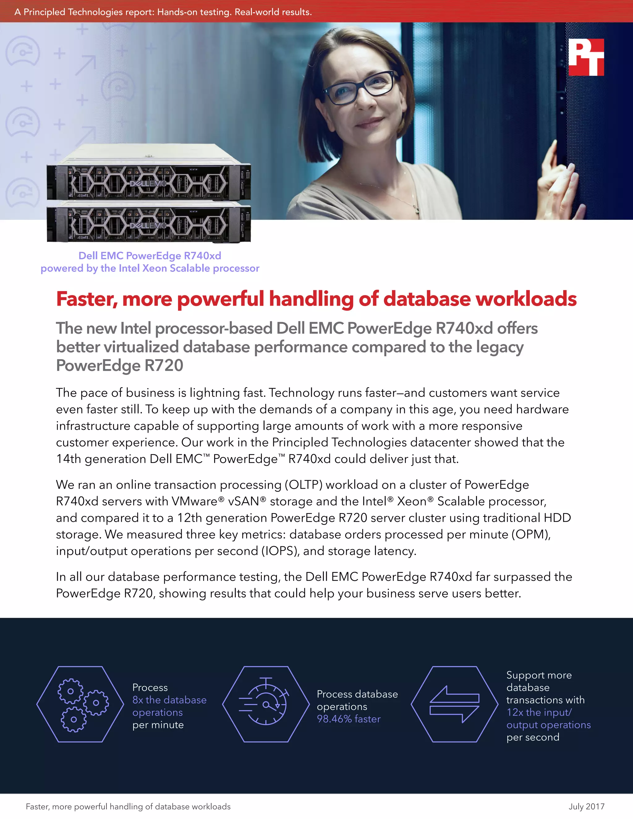 The document compares the performance of Dell PowerEdge R740xd servers with Intel Xeon Scalable processors using VMware vSAN storage against Dell PowerEdge R720 servers using traditional HDD storage. Testing showed the R740xd cluster processed database transactions 8 times faster, supported 12 times the input/output operations, and had 98% lower storage latency. This superior performance from the newer hardware could help businesses better support customer needs.