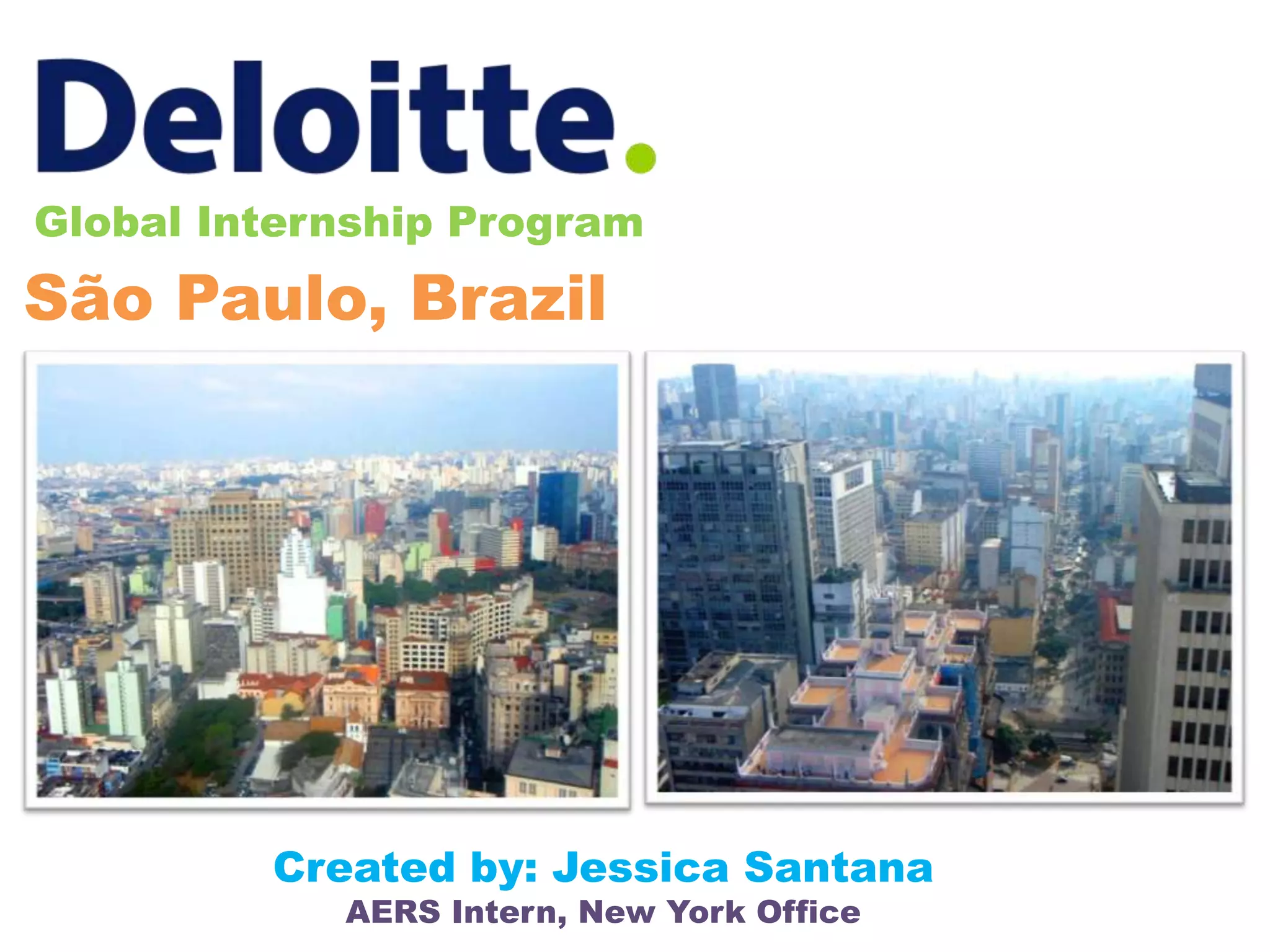 This document summarizes the experiences of Jessica Santana, an intern from the United States, participating in a global internship program in São Paulo, Brazil. It introduces the other interns in her class, her mentors, engagement team, living situation, and activities touring São Paulo including visiting landmarks, museums, dining, and nightlife. It also describes her weekend trip to Rio de Janeiro to see famous sites like Christ the Redeemer and beaches.