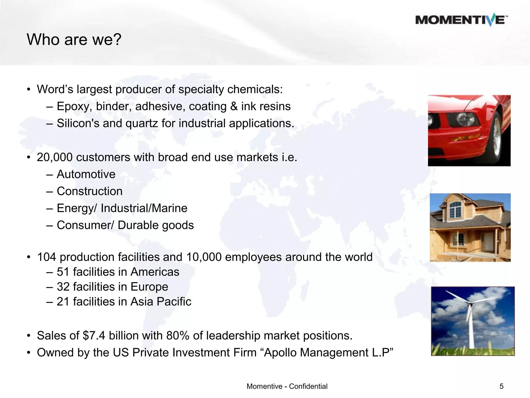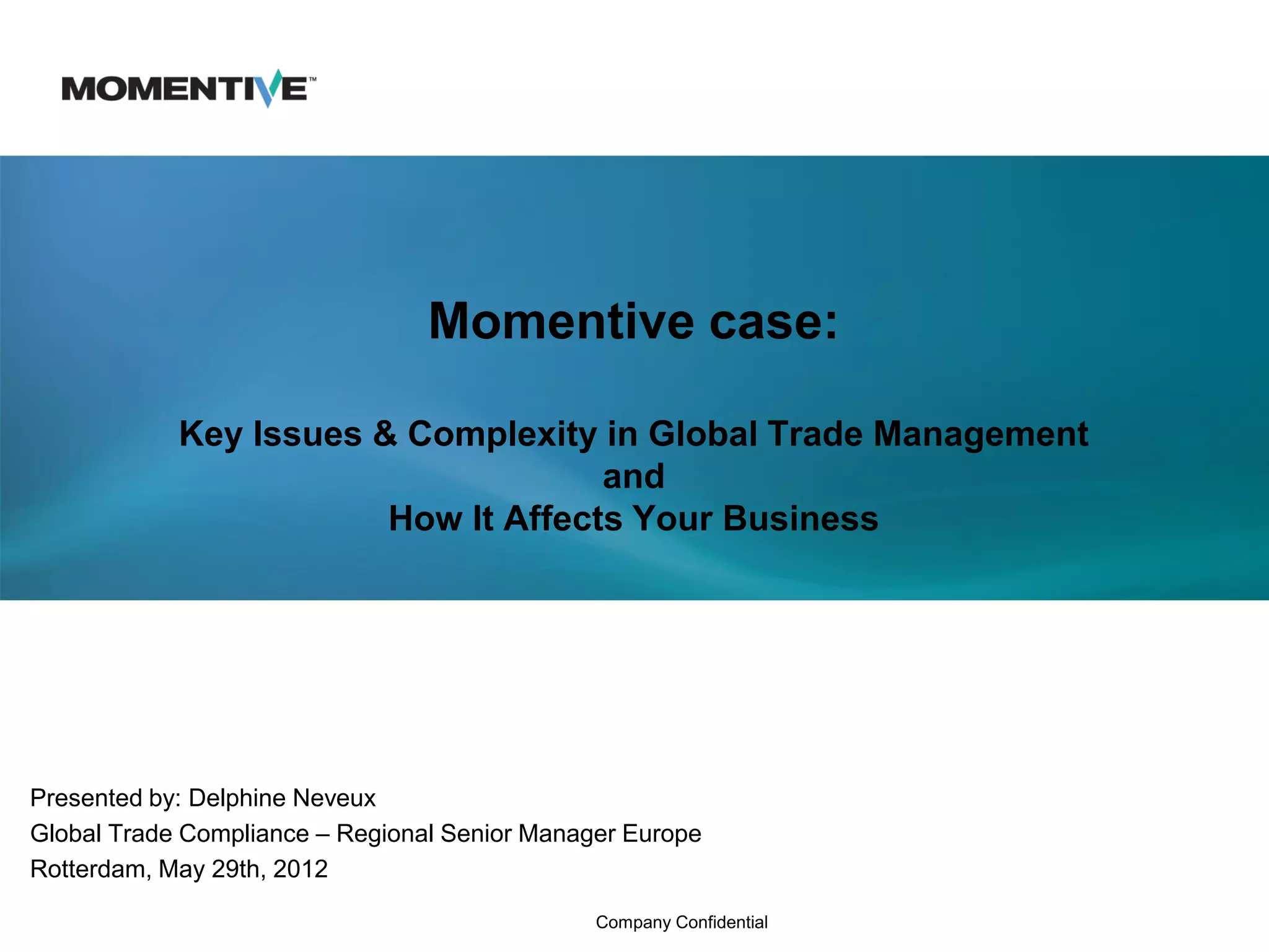 This document provides an overview of Momentive, a global producer of specialty chemicals, and discusses the key challenges they face in global trade management and compliance. It outlines their 5-part internal controls program to address these challenges: 1) Management commitment and resources, 2) Policies and procedures, 3) Risk assessment and oversight, 4) Training and communication, and 5) Corrective actions. Momentive has implemented measures like a restricted party screening software, trade compliance group, and targeted training to strengthen their controls program.