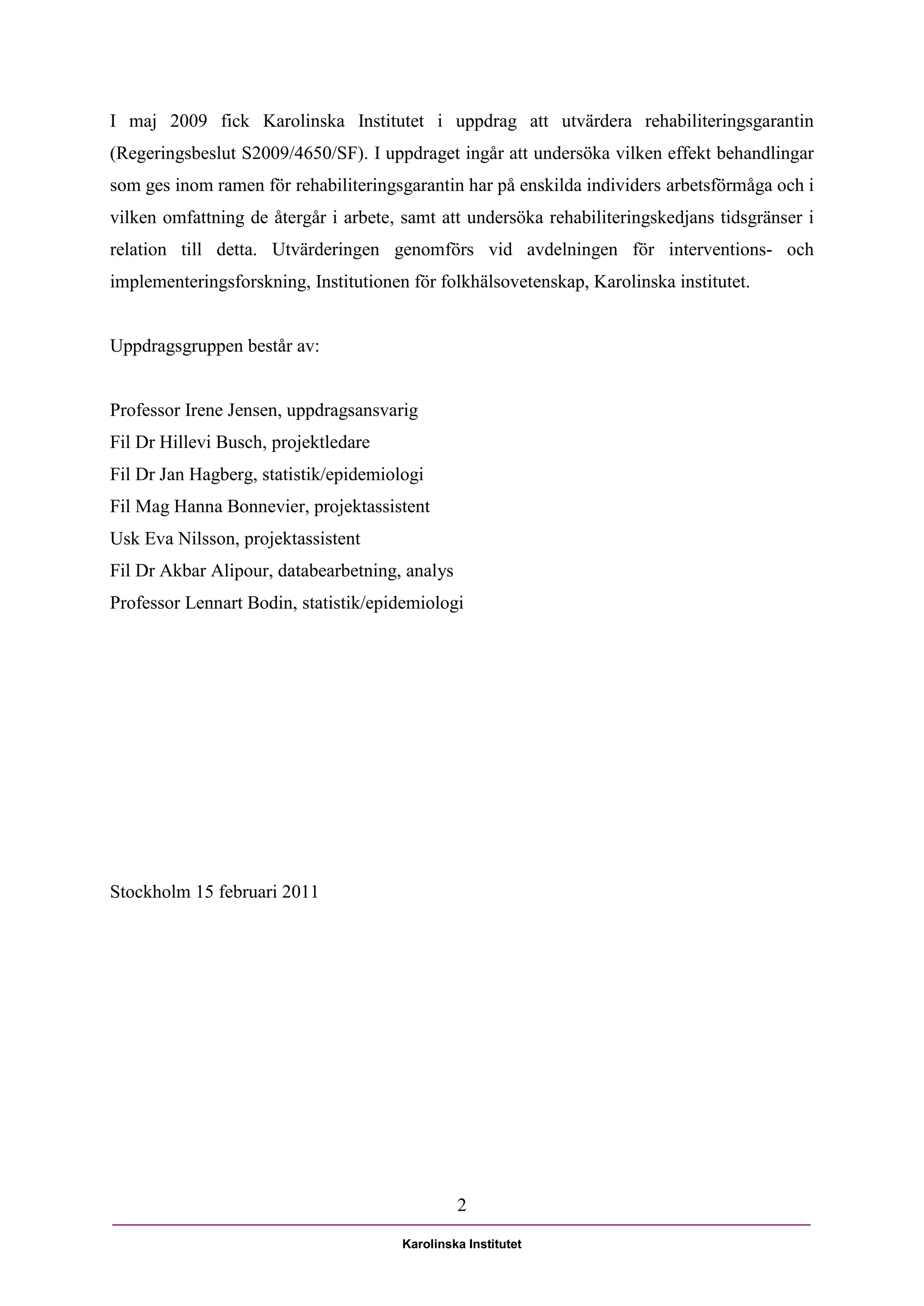 Referenser 1. Socialstyrelsen, Socialstyrelsens uppföljning och bedömning av landstingens insatser inom ramen för rehabiliteringsgarantin 2010. 2. Busch, H. and I.B. Jensen, En nationell utvärdering av rehabiliteringsgarantins effekter på sjukfrånvaron. delrapport 1. . 2010. 3. SKL, Rehabiliteringsgarantin 2009 - 2010 Erfarenheter 2009 och resultat från första halvåret 2010. 2010. 4. DeSalvo, K.B., et al., Predicting mortality and healthcare utilization with a single question. Health Serv Res, 2005. 40(4): p. 1234-46. 5. Ahlstrom, L., et al., The work ability index and single-item question: associations with sick leave, symptoms, and health--a prospective study of women on long-term sick leave. Scand J Work Environ Health, 2010. 36(5): p. 404-12. 6. Bergstrom, G., et al., Sickness presenteeism today, sickness absenteeism tomorrow? A prospective study on sickness presenteeism and future sickness absenteeism. J Occup Environ Med, 2009. 51(6): p. 629-38. 7. Iles, R.A., M. Davidson, and N.F. Taylor, Psychosocial predictors of failure to return to work in non-chronic non-specific low back pain: a systematic review. Occup Environ Med, 2008. 65(8): p. 507-17. 8. Westman, A., et al., Do psychosocial factors predict disability and health at a 3-year follow-up for patients with non-acute musculoskeletal pain? A validation of the Orebro Musculoskeletal Pain Screening Questionnaire. Eur J Pain, 2008. 12(5): p. 641-9. 9. SMS-Track, SMS -Track Questionnaire 1.1.3. 2007. 10. Axén I, et al., Using text messages (SMS) to collect frequent data for evaluation of the six months clinical course of low back pain – scrutiny of a novel method. . European Journal of Pain -Submitted in December 2010. 11. Jensen, I., Utvärdering av behandling av stressrelaterad psykisk ohälsa inom Stressnätverket Stockholm 2008-2009. Slutrapport. 2011. 12. SBU, Behandling av depressionssjukdomar. En systematisk litteraturöversikt. 2004, Statens beredning för medicinsk utvärdering.: Stockholm. 13. SBU, Rehabilitering vid långvarig smärta. En systematisk litteraturöversikt. 2010, Statens Beredning för medicinsk utvärdering (SBU): Stockholm. 14. van Oostrom, S.H., et al., Development of a workplace intervention for sick-listed employees with stress-related mental disorders: Intervention Mapping as a useful tool. BMC Health Serv Res, 2007. 7: p. 127. 15. Jensen, I. and A. Alipour, Arbetslivsinriktad rehabilitering – att återfå arbetsförmågan genom åtgärder på arbetsplatsen, in Inkluderande arbetsliv, A. kunskapsrådet, Editor. 2010, Fritzes: Stockholm. 16. Jensen, I.B., et al., Cost effectiveness of two rehabilitation programmes for neck and back pain patients: A seven year follow-up. Pain, 2009. 142(3): p. 202-8. 17. Norlund, A., A. Ropponen, and K. Alexanderson, Multidisciplinary interventions: review of studies of return to work after rehabilitation for low back pain. J Rehabil Med, 2009. 41(3): p. 115-21. 18. Busch, H., et al., Patterns of sickness absence a decade after multidisciplinary rehabilitation. Pain, In press. 19. Socialstyrelsen, Nationella riktlinjer för rörelseorganens sjukdomar 2010 - stöd för styrning och ledning - Preliminär version. 2010: Stockholm. 65 Karolinska Institutet