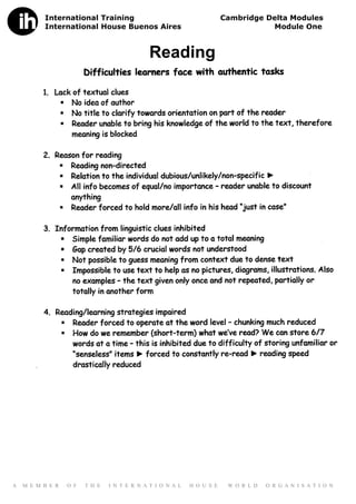 This document provides information about an international training program at International House Buenos Aires. It discusses Cambridge Delta Modules and identifies the topic of Module One as Reading. The final line indicates that International House Buenos Aires is a member of the International House World Organisation.