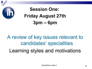 The document discusses choosing a specialism for a Delta teaching qualification. It provides examples of specialisms like teaching business English, young learners, English for academic purposes. Candidates must research their chosen specialism and focus on a specific aspect. The document gives guidance on what to include in part 1 of the assignment, such as describing the specialism and reviewing relevant literature. It also provides examples of stronger assignments that referenced background reading and considered issues related to the specialism.
