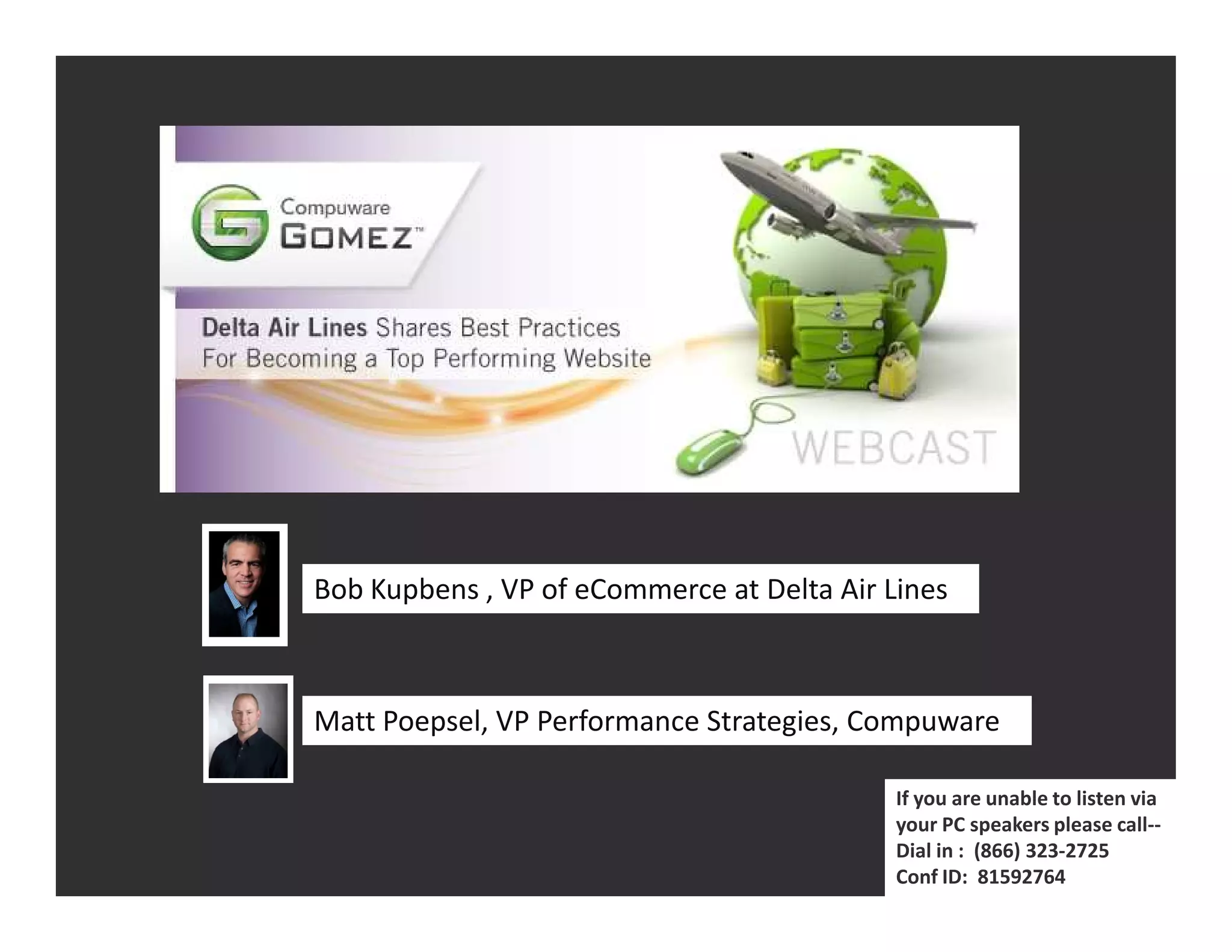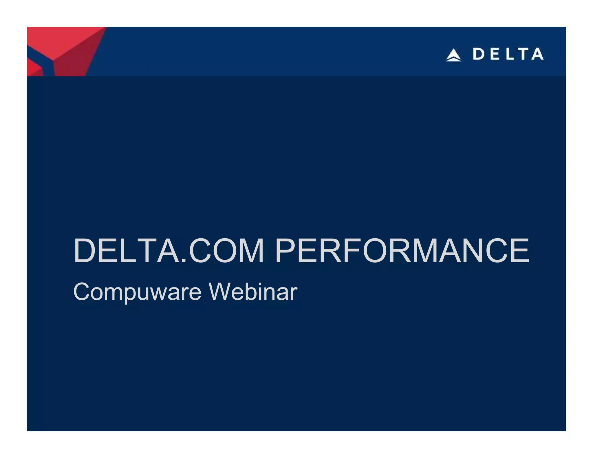The document focuses on the performance and improvements of delta.com, highlighting its significant web traffic and user expectations for speed. It presents a case study of updates made to the website in 2010 that resulted in increased online check-ins and flight searches. Key metrics and collaborative strategies are outlined for continuous performance measurement and enhancement across digital platforms.