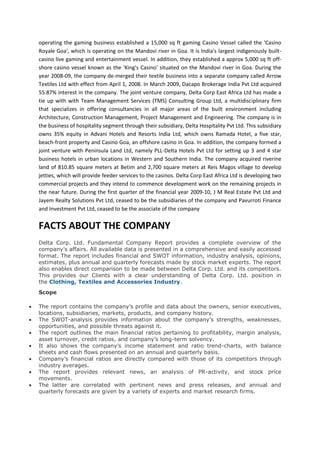 Delta Corp Ltd is an Indian conglomerate operating in real estate, entertainment & gaming, aviation, and hospitality. It was founded in 1990 and is headquartered in Mumbai. The company owns subsidiaries in various industries and has expanded operations through acquisitions. Key executives are outlined along with their backgrounds and experience in relevant industries.