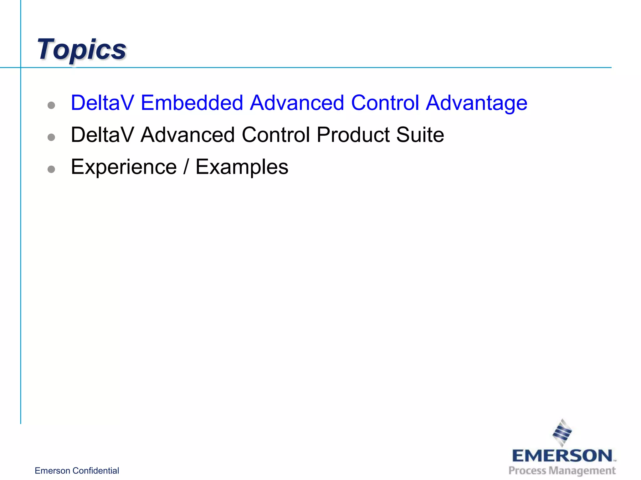 This document provides an overview of DeltaV Embedded Advanced Control. It discusses how DeltaV makes advanced control easy to implement and sustain through three main products: