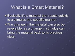 The document provides an overview of smart materials, which react to stimuli in a specific manner, including shape memory alloys (SMAs), smart gels, rheological materials, and fullerenes. SMAs exhibit pseudo-elasticity and a shape memory effect, while smart gels expand or contract in response to various stimuli. Applications across industries, including aeronautics, medicine, and bioengineering, highlight the potential of these materials for innovative solutions.