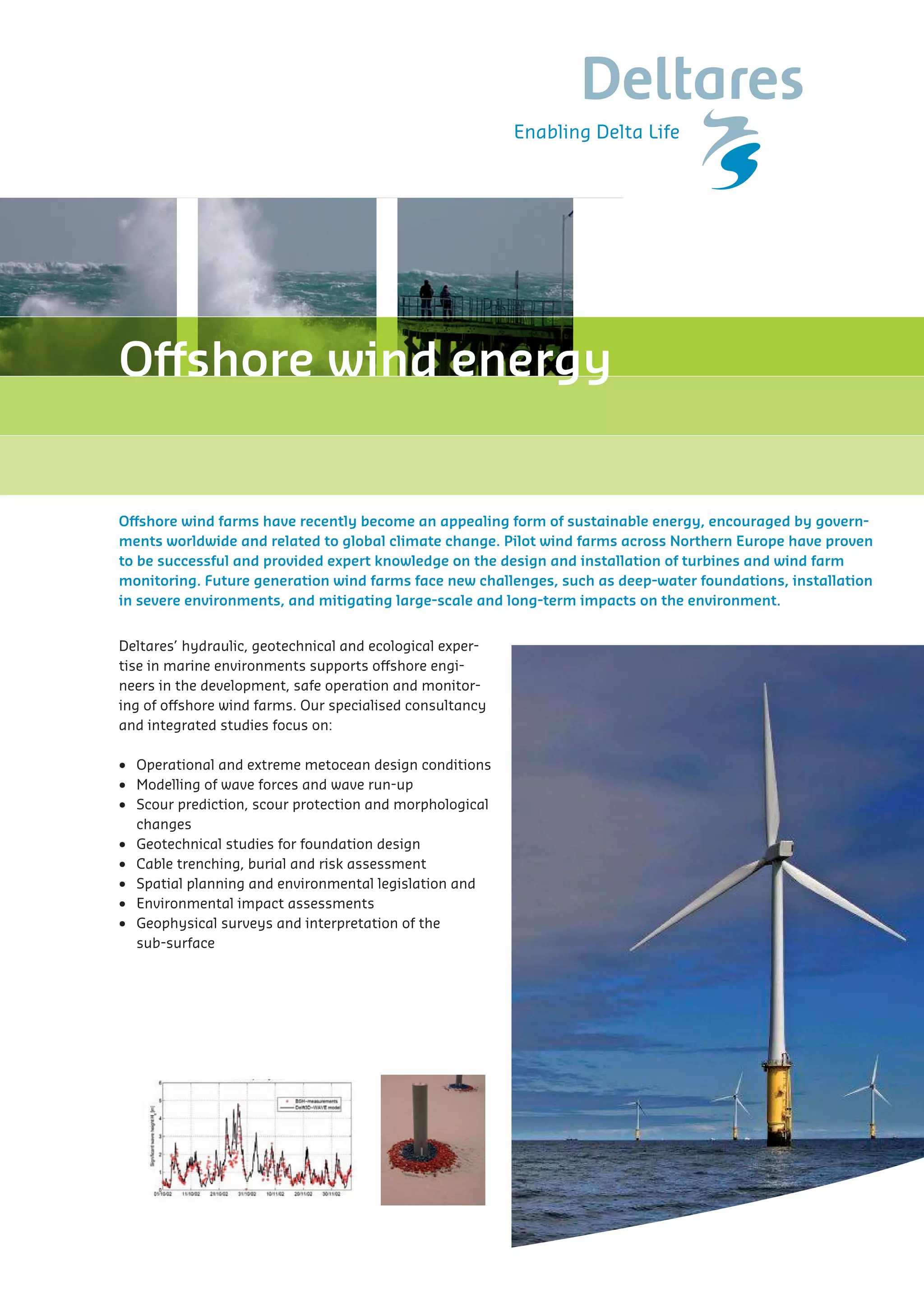 The document discusses the expertise of Deltares in offshore wind energy, particularly in the design, installation, and monitoring of wind farms amidst challenges like deep-water foundations and severe environments. Deltares provides comprehensive consultancy services focusing on environmental impact assessments, geotechnical studies, and metocean conditions to support the successful operation of offshore wind projects. Techniques such as numerical modeling and scour prediction form part of their approach to ensure stability and effectiveness in offshore wind energy installations.