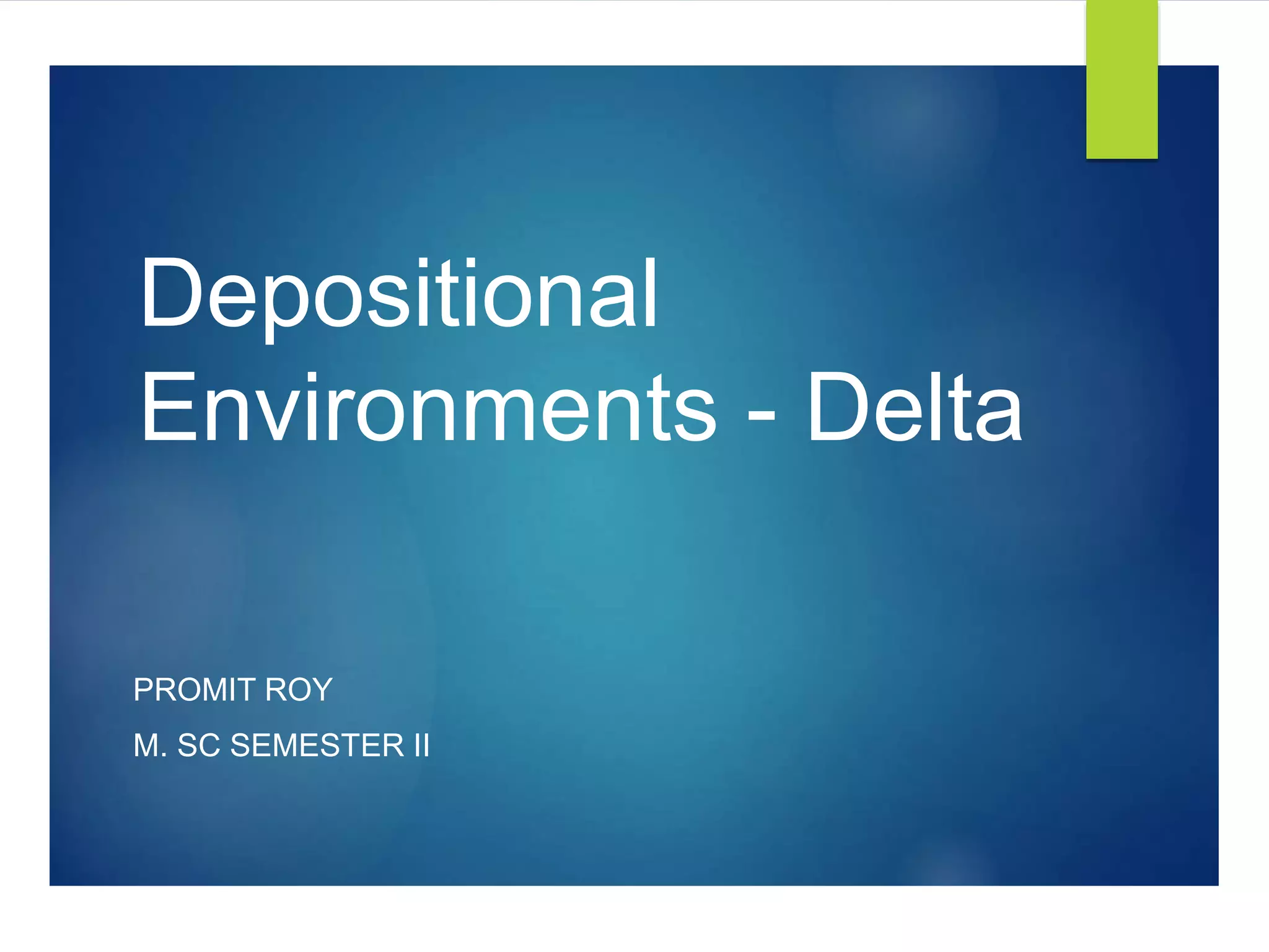 This document discusses deltaic depositional environments. It defines deltas and differentiates them from estuaries and river mouths. The key types of deltas are described as being river-dominated, wave-dominated, or tide-dominated. Characteristics and controlling processes of each type are provided, along with examples. The shapes, sub-environments, structures, lithofacies, and characteristics of deltaic deposits are outlined. Ancient deltas are described as thick clastic successions that fine upward from offshore to fluvial facies.