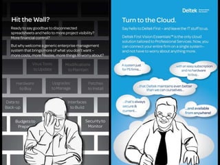 1. The document discusses a cloud-based project management solution called Deltek First Vision Essentials that is designed specifically for professional services (PS) firms.