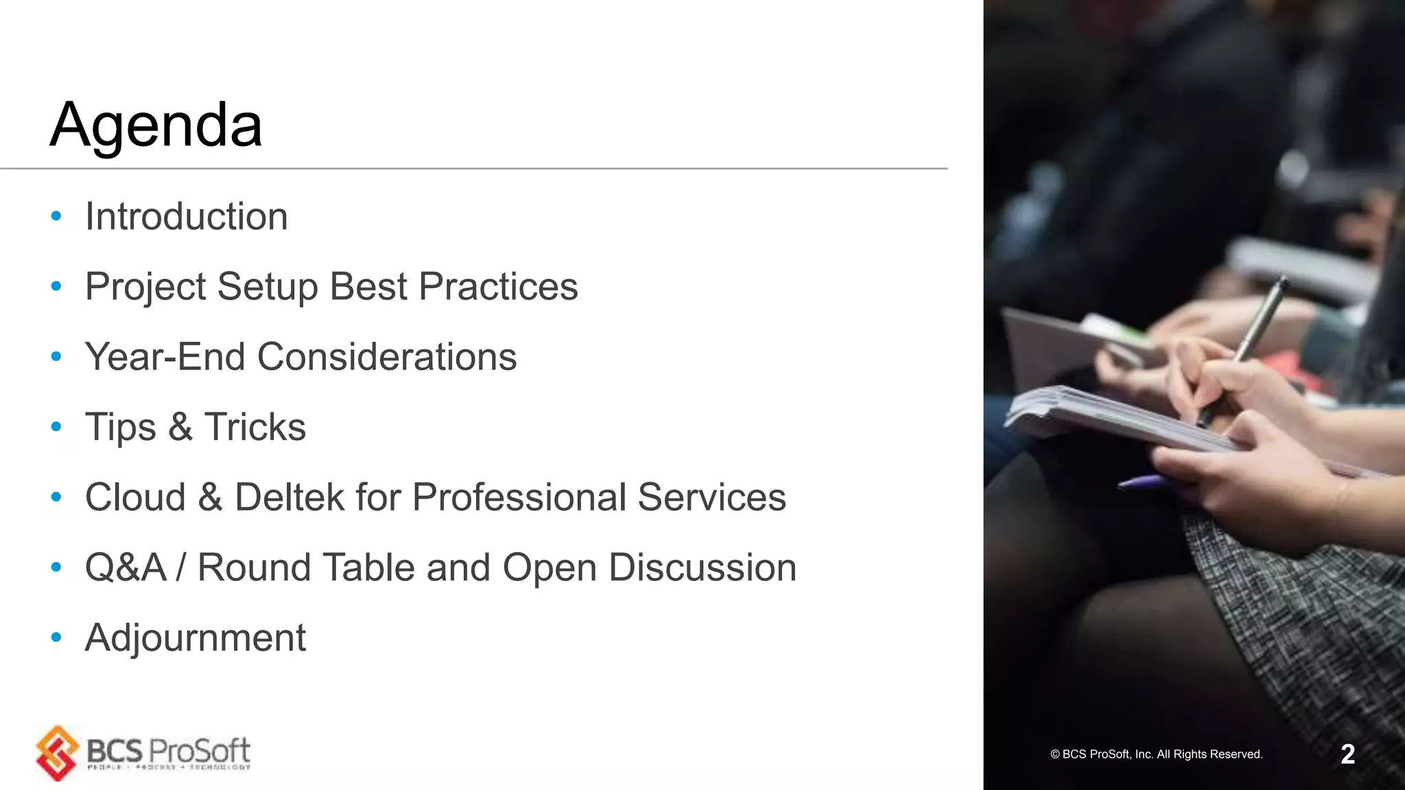 The document outlines the agenda and key topics discussed at the Deltek Vision User Group meeting in November 2017, focusing on best practices for project setup, year-end considerations, and tips for using Deltek for professional services. It emphasizes the importance of effective project setup in facilitating accurate billing, budgeting, and reporting and highlights the transition towards cloud solutions. Additionally, it includes a section for questions and discussions about the future of Deltek's offerings and advises on optimizing business processes.
