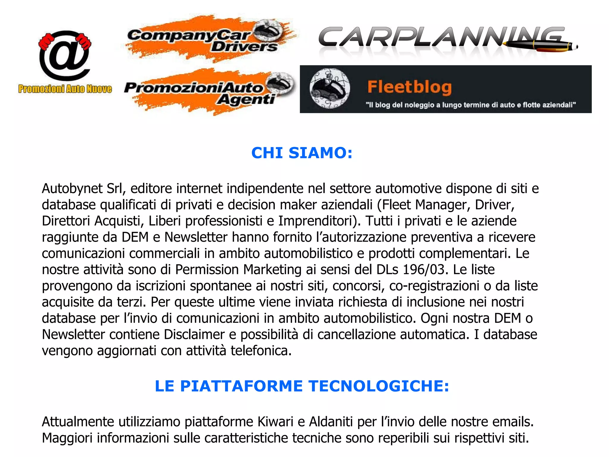 Autobynet srl è un editore indipendente nel settore automotive, con database di utenti privati e decision maker aziendali, utilizzando metodi di permission marketing. Offre diverse mailing list specializzate per campagne di direct email marketing e postale, mirate a specifici gruppi, come automobilisti, agenti di commercio e fleet manager. L'azienda ha registrato oltre 1.3 milioni di utenti privati e 240.000 veicoli in flotta attraverso i suoi servizi, finalizzati a fornire vantaggi economici e promozioni personalizzate nel mercato automobilistico.