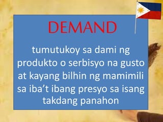 Ang dokumento ay nagpapakita ng mga pangunahing konsepto ukol sa demand, kasama ang ugnayan ng presyo at quantity demanded. Tinatalakay nito ang iba't ibang salik na nakakaapekto sa demand gaya ng kakayahan ng mamimili, panlasa, at inaasahan sa hinaharap. Makatutulong ang mga kaalamang ito sa matalinong pagdedesisyon ng mga konsyumer at prodyuser para sa kaunlaran ng bansa.