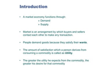 1) The document discusses the theory of demand and supply. It defines demand as the quantities of a good that consumers are willing and able to purchase at various prices. Supply is defined as the quantities of a good that producers are willing to offer for sale at various prices.