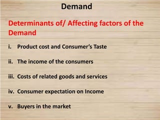 The document discusses demand, including the definition of demand, demand schedules, the law of demand, determinants of demand, types of demand, individual and market demand curves, elasticity of demand, and changes in demand. Specifically, it defines demand as the quantity of a product consumers are willing and able to purchase at various prices. It also explains the law of demand, which states that demand is inversely related to price - as price increases, demand decreases, and vice versa. Additionally, it discusses factors that influence demand, such as income, price of related goods, and consumer expectations.