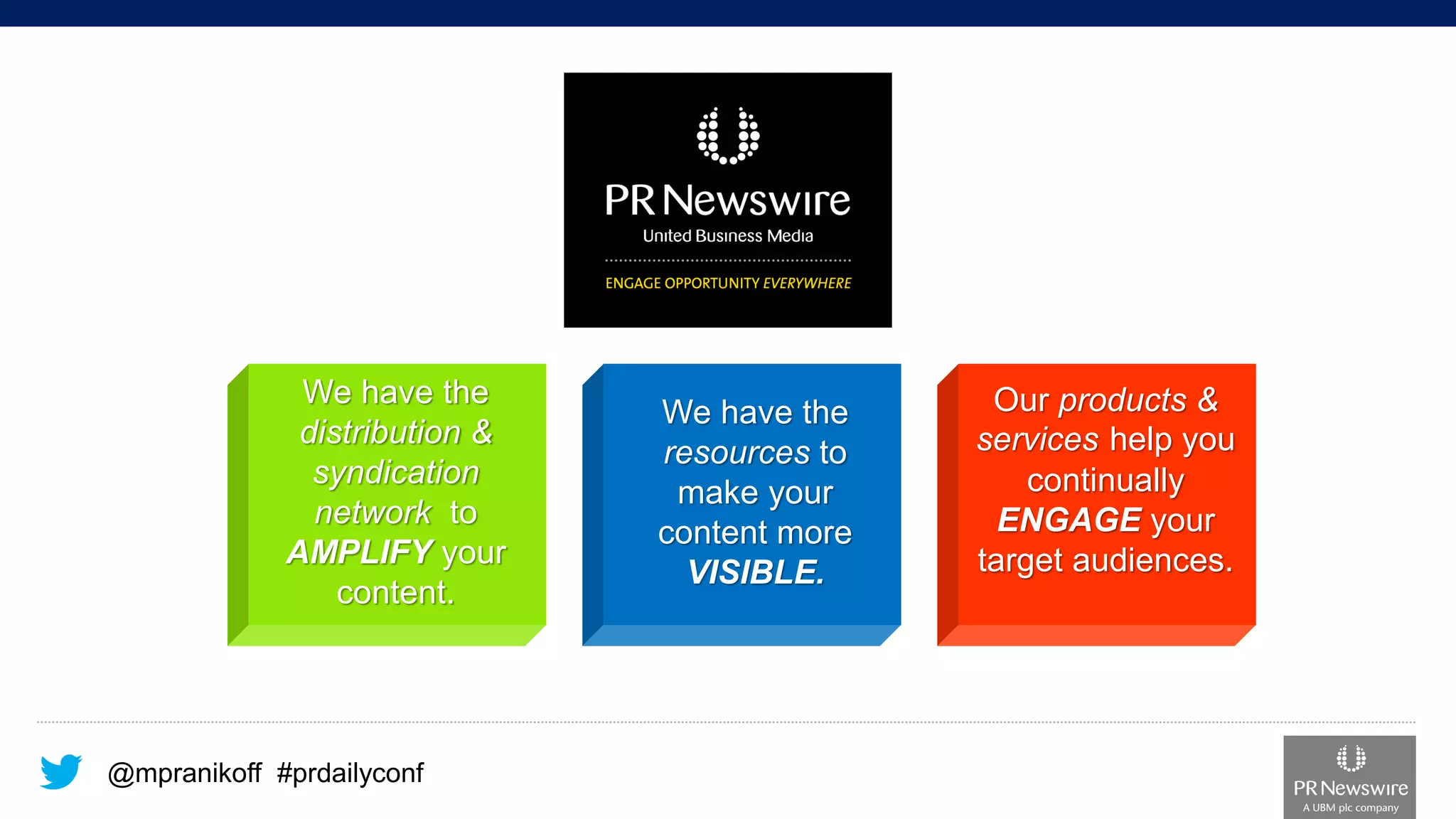 The document discusses how distributing and syndicating content can help amplify and engage target audiences. It emphasizes that content must be mapped to business objectives, appealing, and distributed through owned channels as well as syndication to increase awareness and grow audiences. Effective content includes multimedia like images and video to drive discovery.