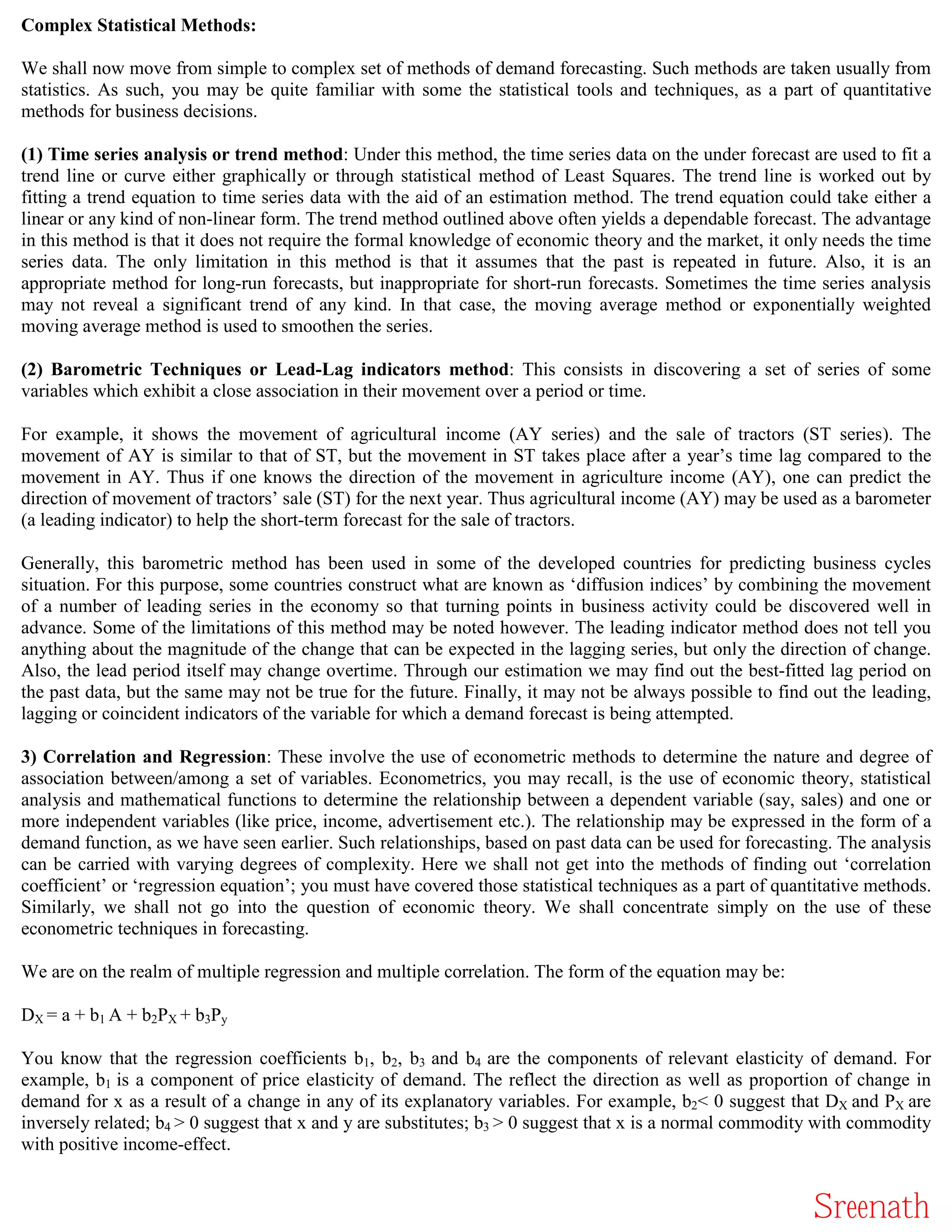 Demand forecasting involves estimating future demand for a product or service. There are two main approaches: obtaining expert opinions or consumer surveys, or using past sales data through statistical techniques. Simple survey methods include expert opinion polls, the Delphi technique to reach consensus among experts, and consumer surveys using complete or sample enumeration. More complex statistical methods include time series analysis to identify trends, using leading economic indicators to forecast changes, and correlation/regression analysis to determine relationships between demand and influencing factors like price, income, and advertising. The most sophisticated method is simultaneous equation modeling or developing an econometric model of an entire economy.