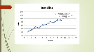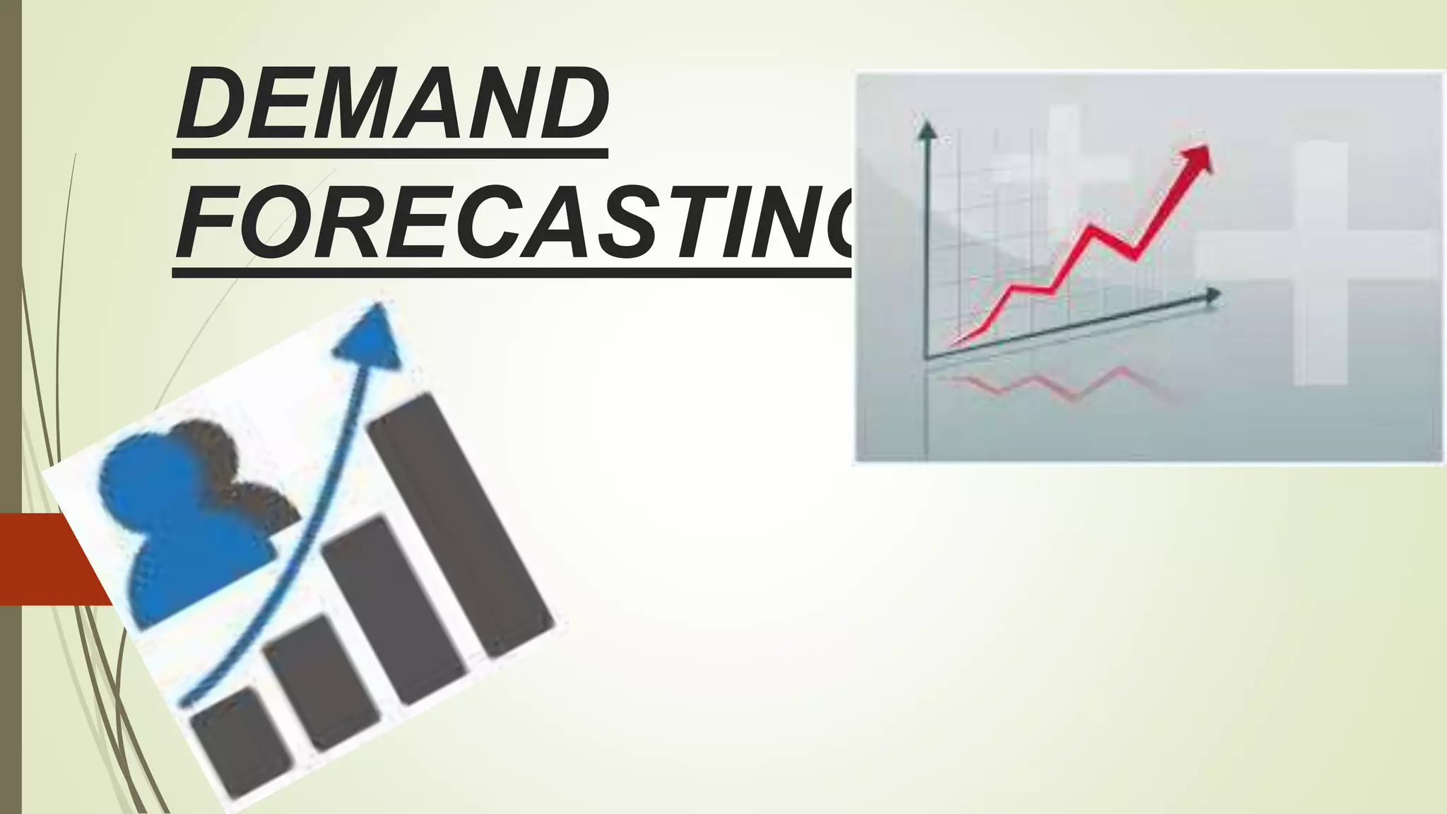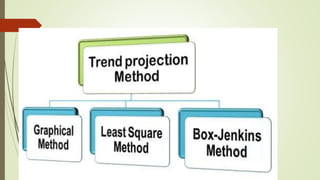 The document discusses demand forecasting, including its meaning, objectives in the short and long term, types including short, medium and long term forecasting, determinants for different goods, requirements for good forecasting, techniques like consumer surveys and opinion methods, and steps involved in the forecasting process. It provides details on objectives like arranging labor, finances and production, as well as factors that influence demand for different goods and methods for collecting information and opinions to forecast future demand.