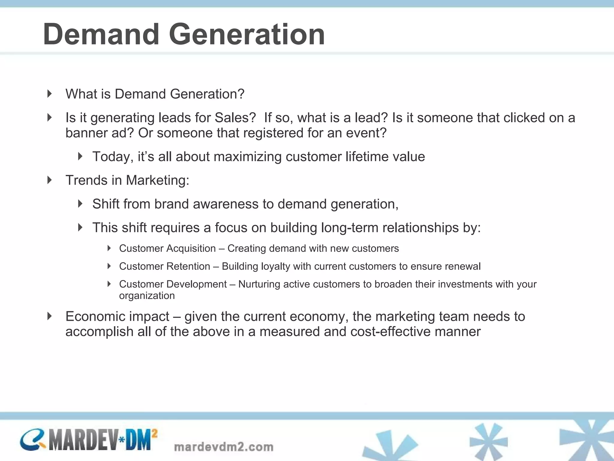The document discusses demand generation and how to implement it within an organization. It emphasizes understanding the customer buying cycle and mapping marketing and sales activities to different stages of the cycle. It also discusses lead generation, scoring leads based on profile and engagement level to prioritize nurturing, and implementing a strategic nurturing program with personalized, relevant content to build trust and educate prospects over time.