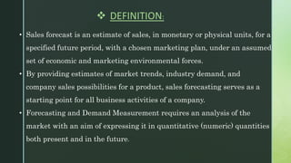 1. The document discusses demand measurement and sales forecasting. It defines sales forecasting as an estimate of future sales under a marketing plan and economic conditions.