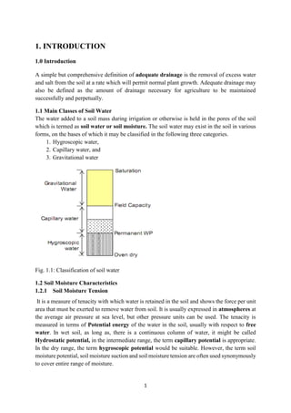 1. The document defines soil water and classifies it into three categories: hygroscopic water, capillary water, and gravitational water.