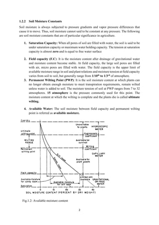 2. It discusses key soil moisture concepts like field capacity, permanent wilting point, and available water. Field capacity is the moisture level after drainage of gravitational water. Permanent wilting point is the moisture level where plants can no longer obtain enough water. Available water is the range between these two points.